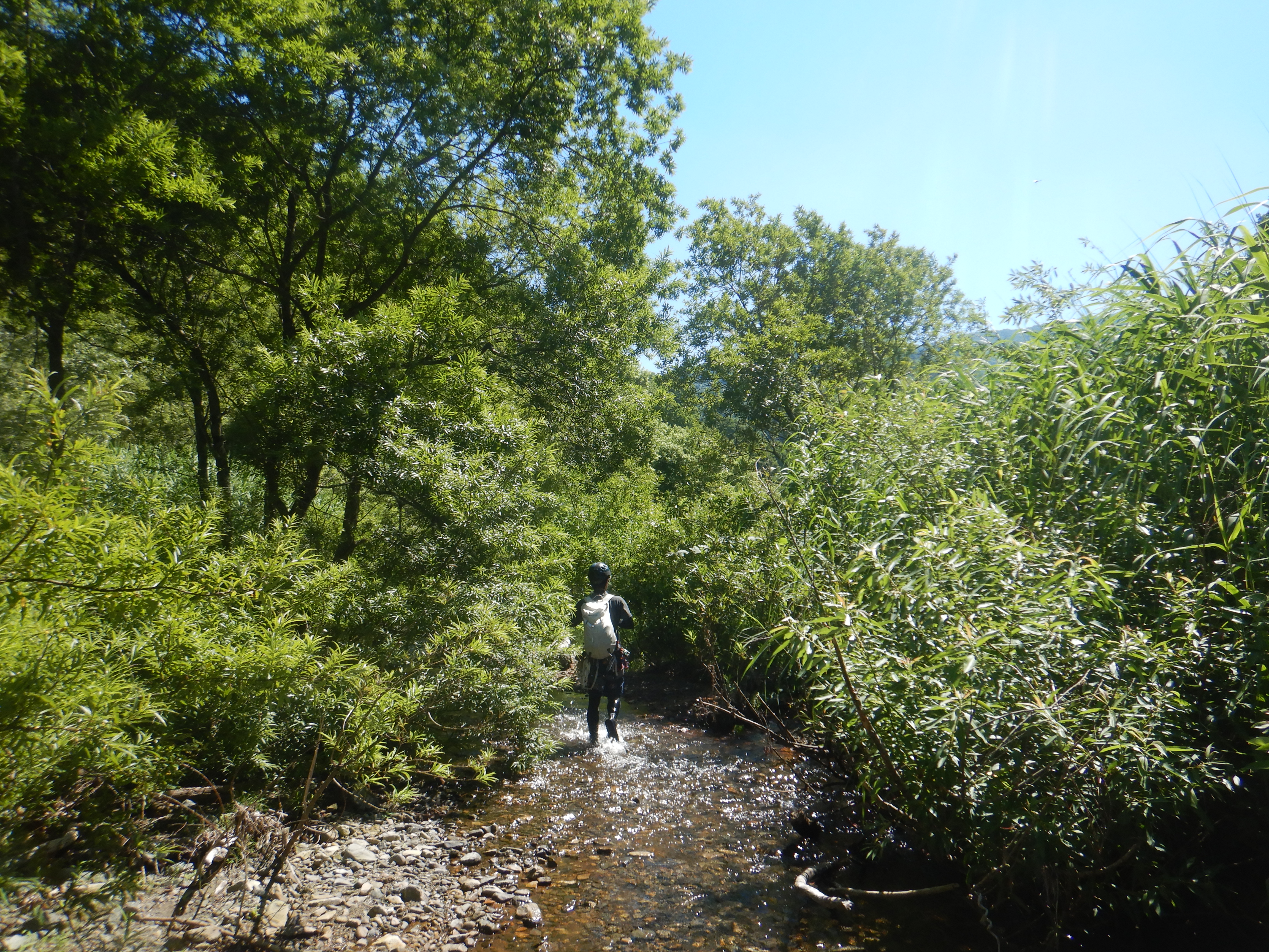 小川を黙々と進むと北沢との二俣。アブの猛攻にめげて、そろそろ帰りましょうよ!と言ってくるのを期待していたが、終始ニコニコでアブの猛攻など全く気に留めていないH山君。強すぎワロタ。