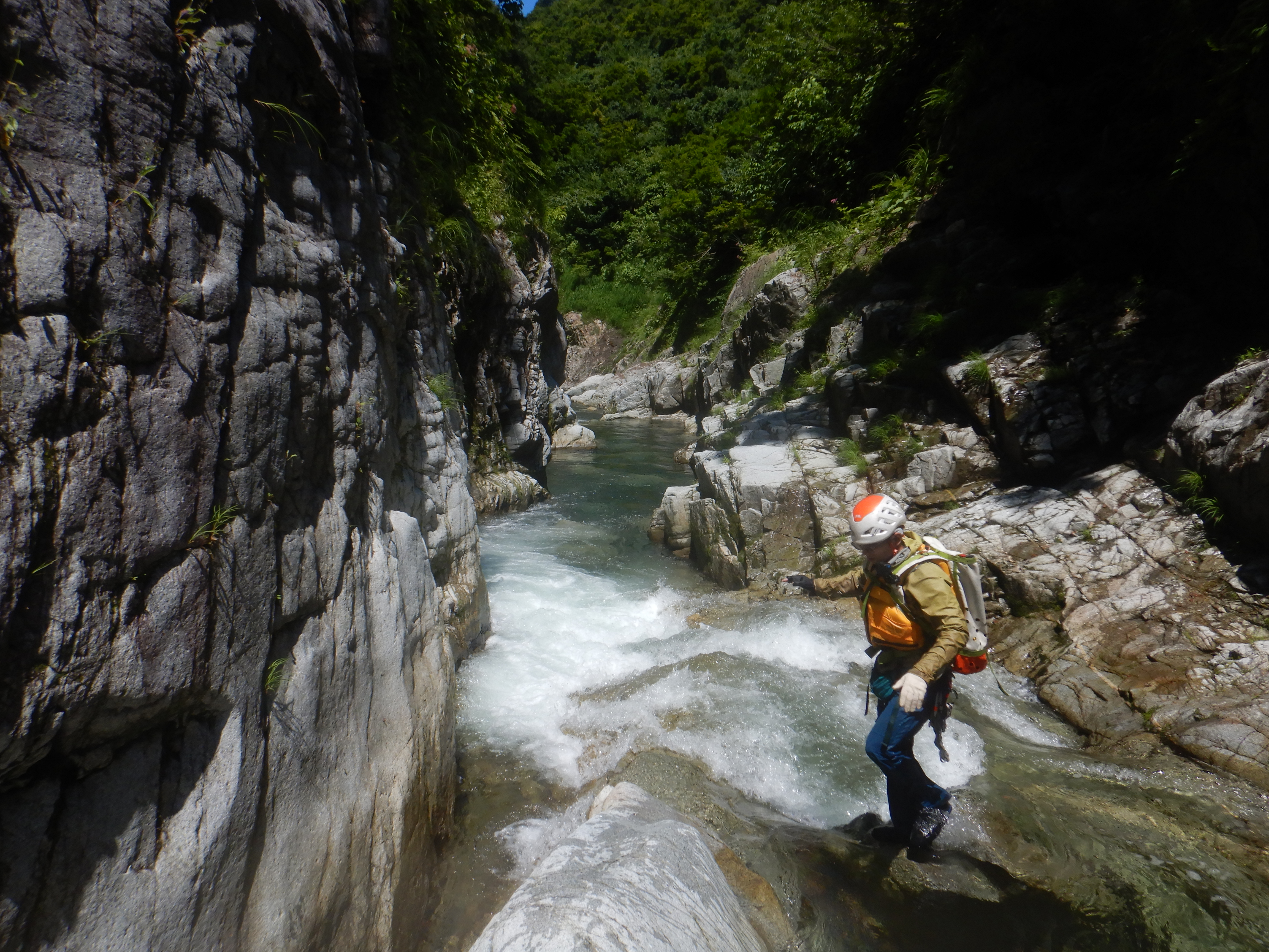 ゴルジュ内で着替えていると何と釣り師が上流から下ってきた!?まさかこんなところに人がいるなんて…。ローカル恐るべし。