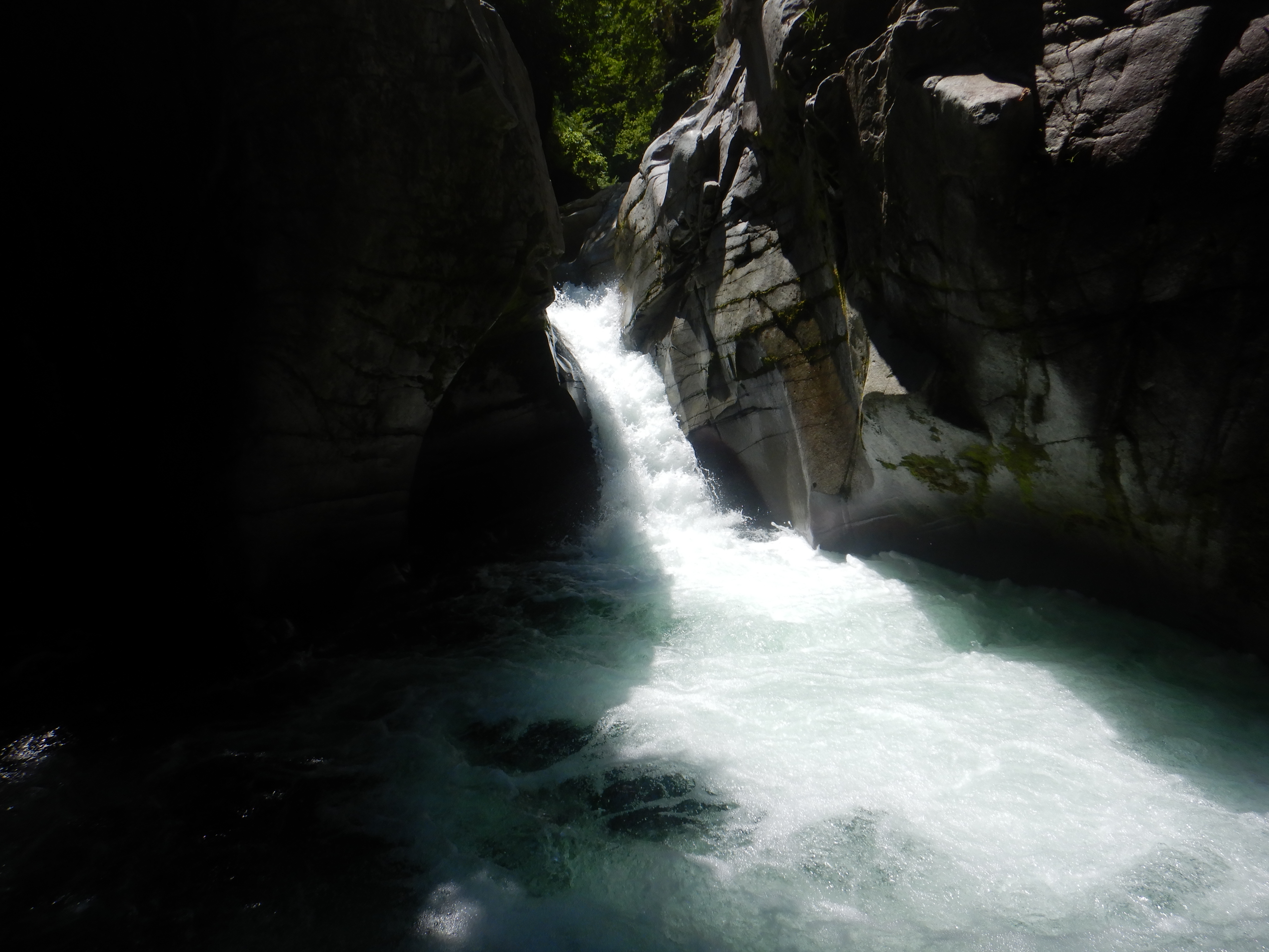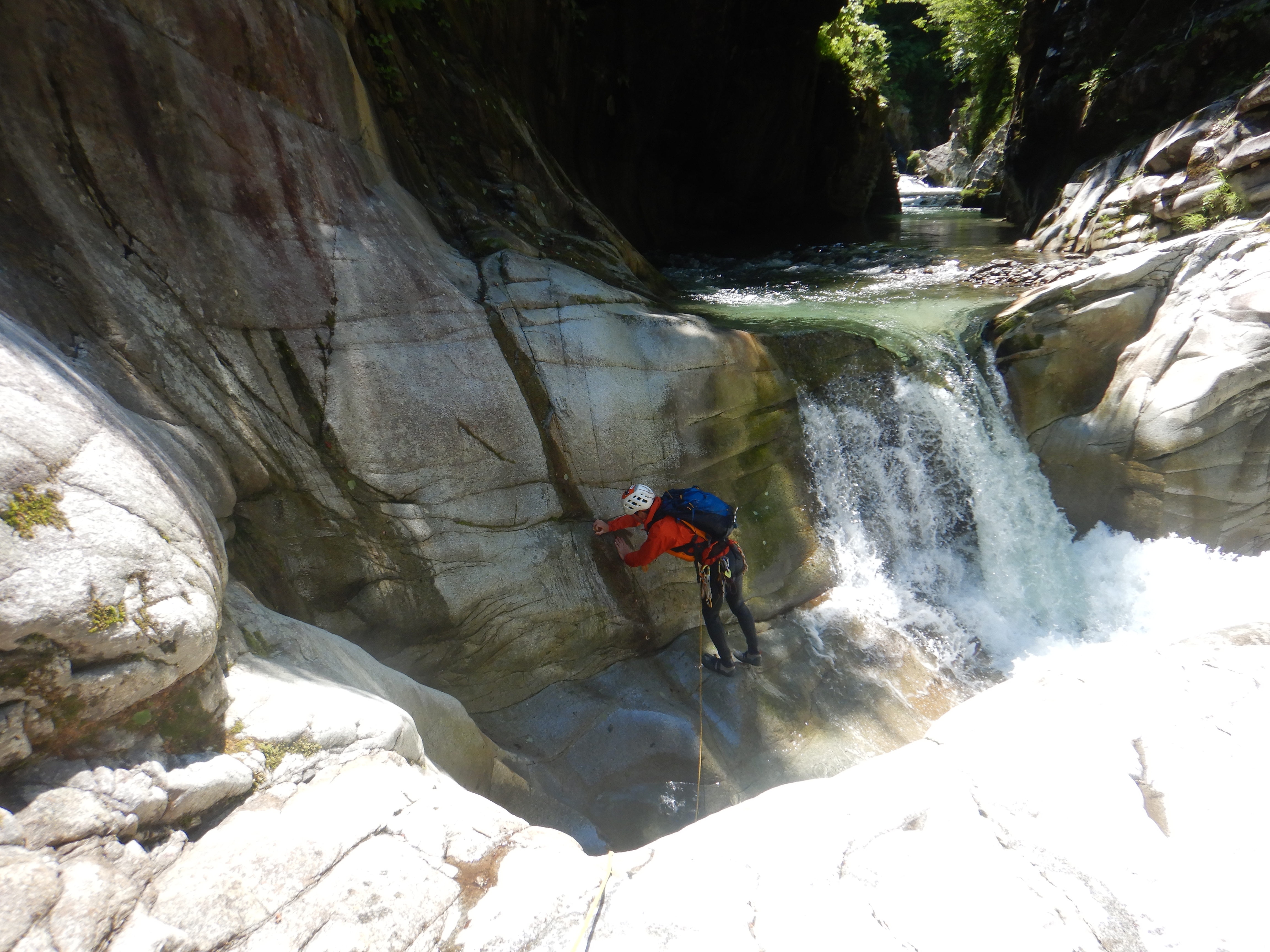 次の2m滝。これは左から取り付くが、かなりヌメヌメな上、普通に難しくてショルダー。最後は滝の落ち口に下る感じになるが、水量が多いとここがかなり危険。ミスれば滝下の渦巻く釜に吹っ飛ばされてエンドだろう…。気を付けたい場所だ。