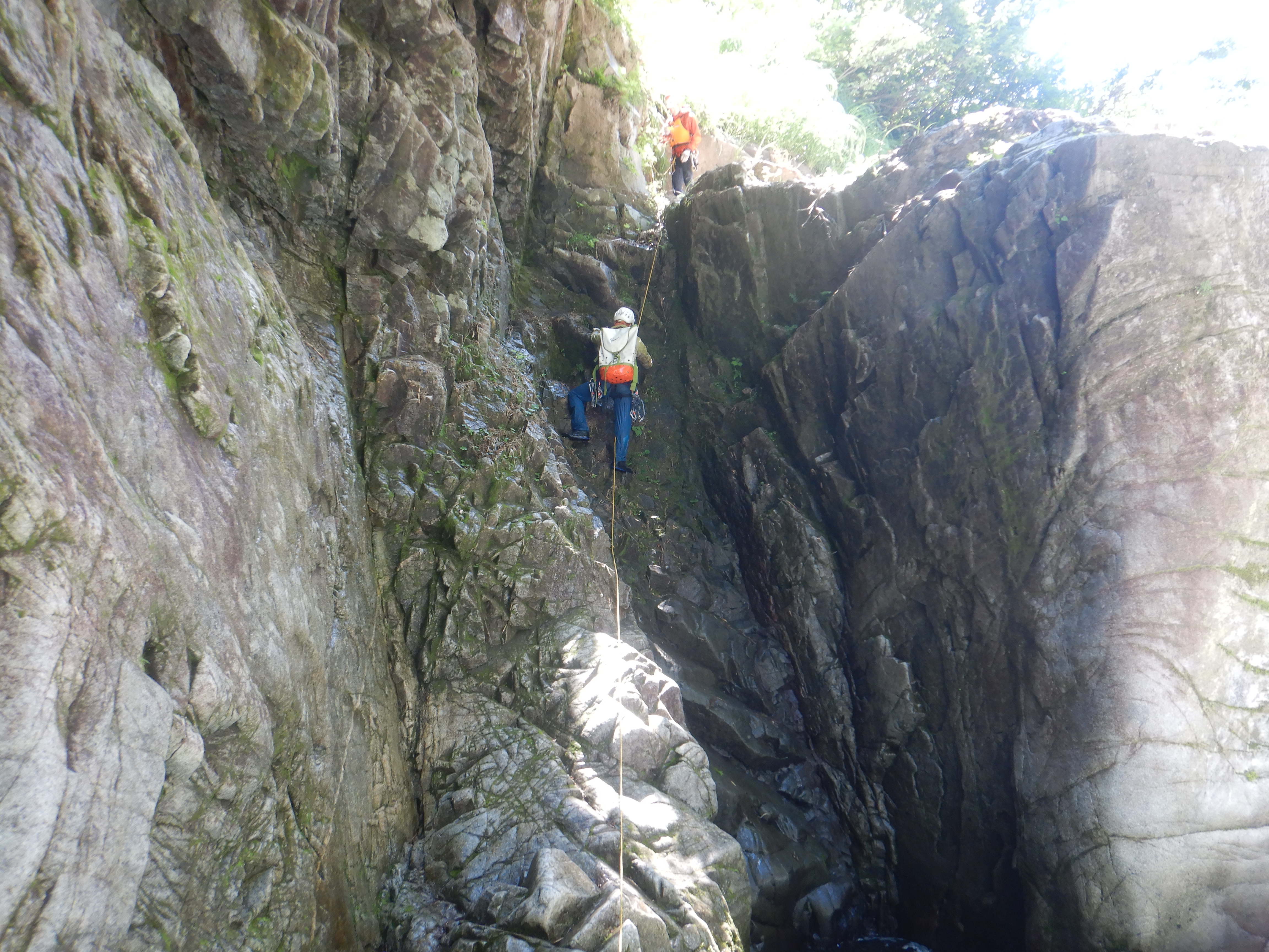 ほそど渓谷は東屋のある遊歩道からゴルジュを下降して遡行し直すというスタイルで登られてきたが、今回はゴルジュ末端から遡ってみることにする。目星を付けた場所から降りて行くが、最後は断崖になって懸垂するハメに。