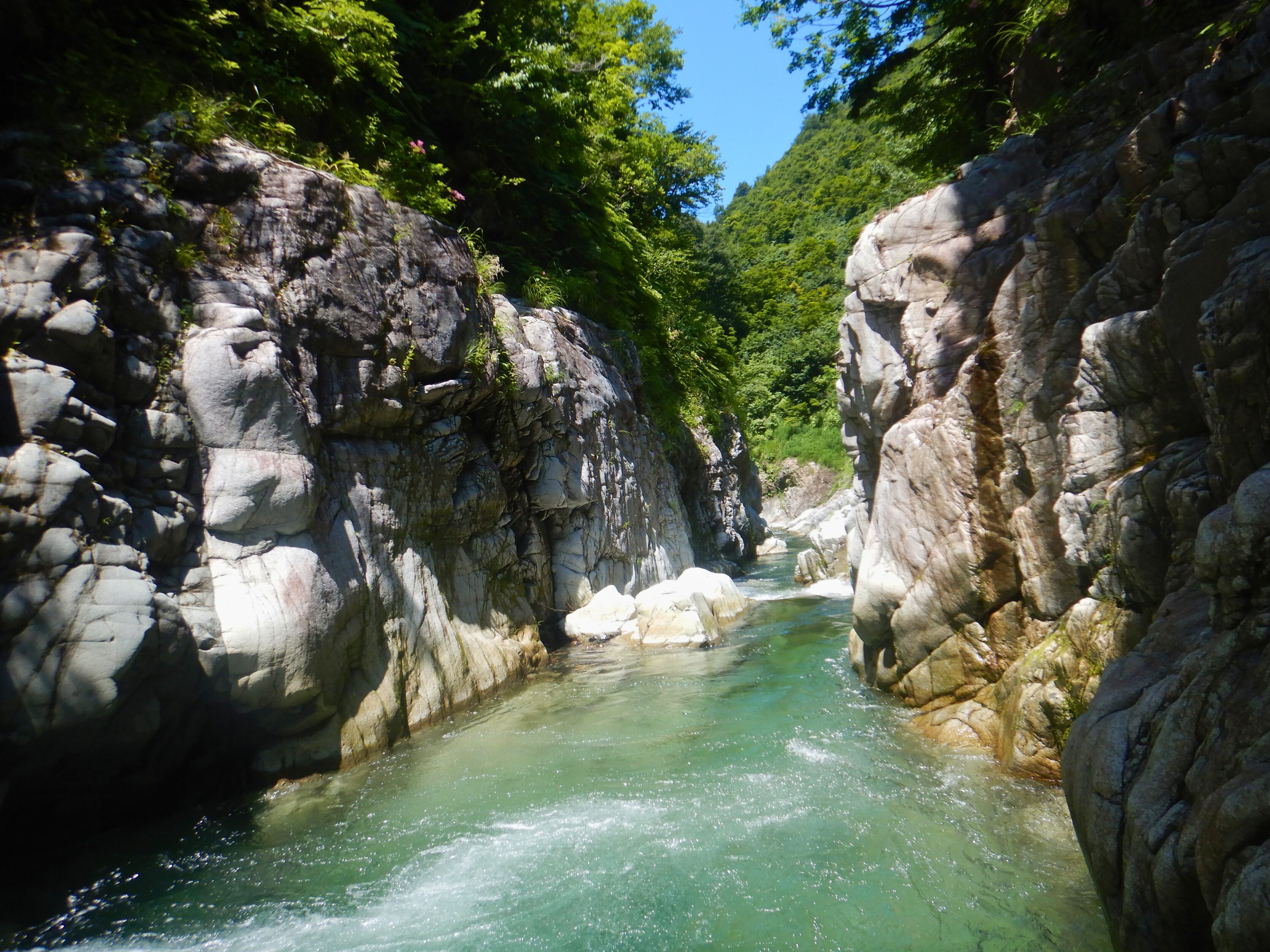 清津峡で朽ち果てた翌日、さすがにレストをしたいがマサと予定を合わせていたため強制沢登り。五十沢下部の予定だったが、気力的に限界なので、近場のコンビニゴルジュへ出かける。ついでに清津峡で大水量系がトラウマになってしまった中澤さんも強制連行。3人でワイワイやることにする。