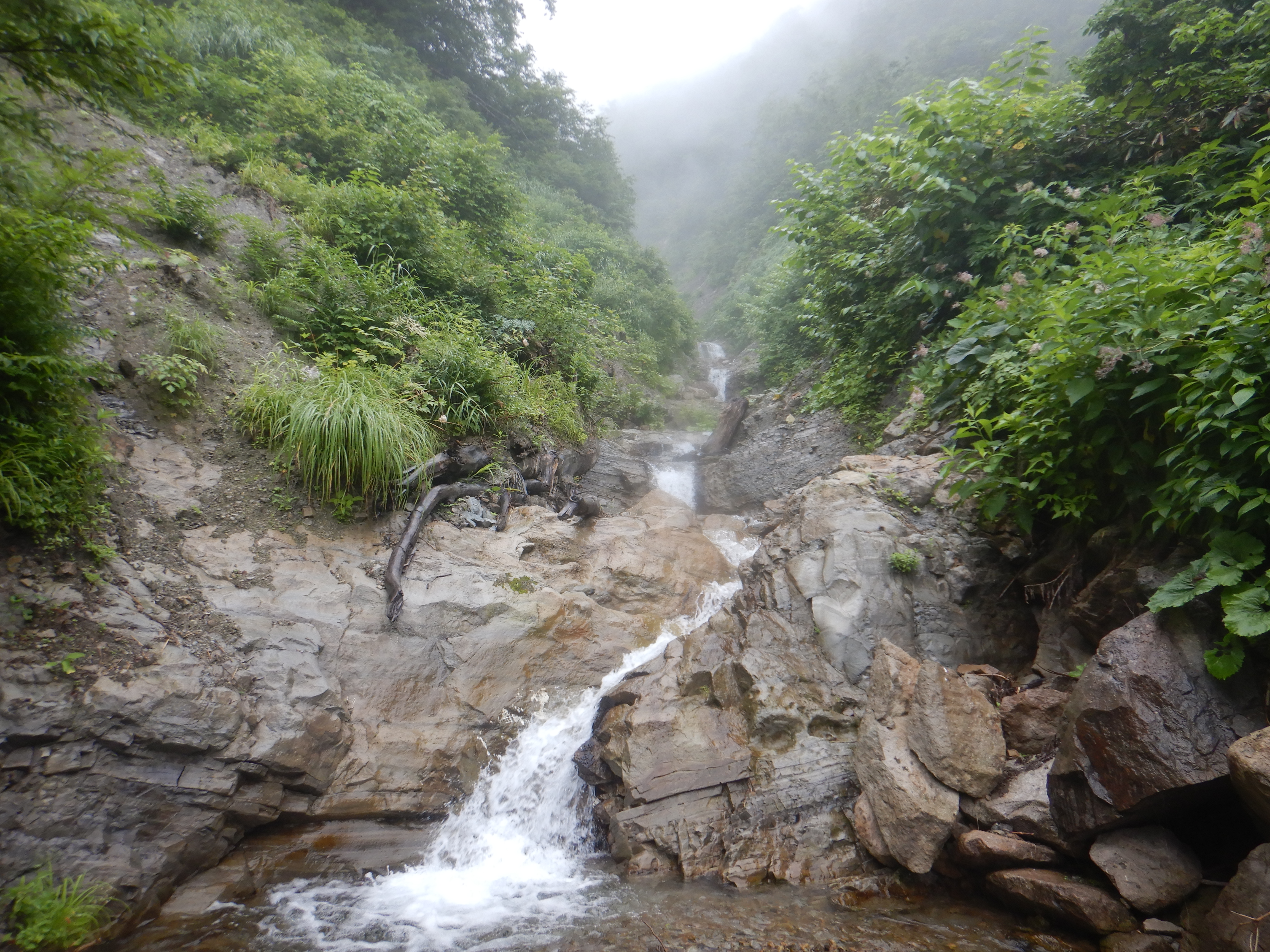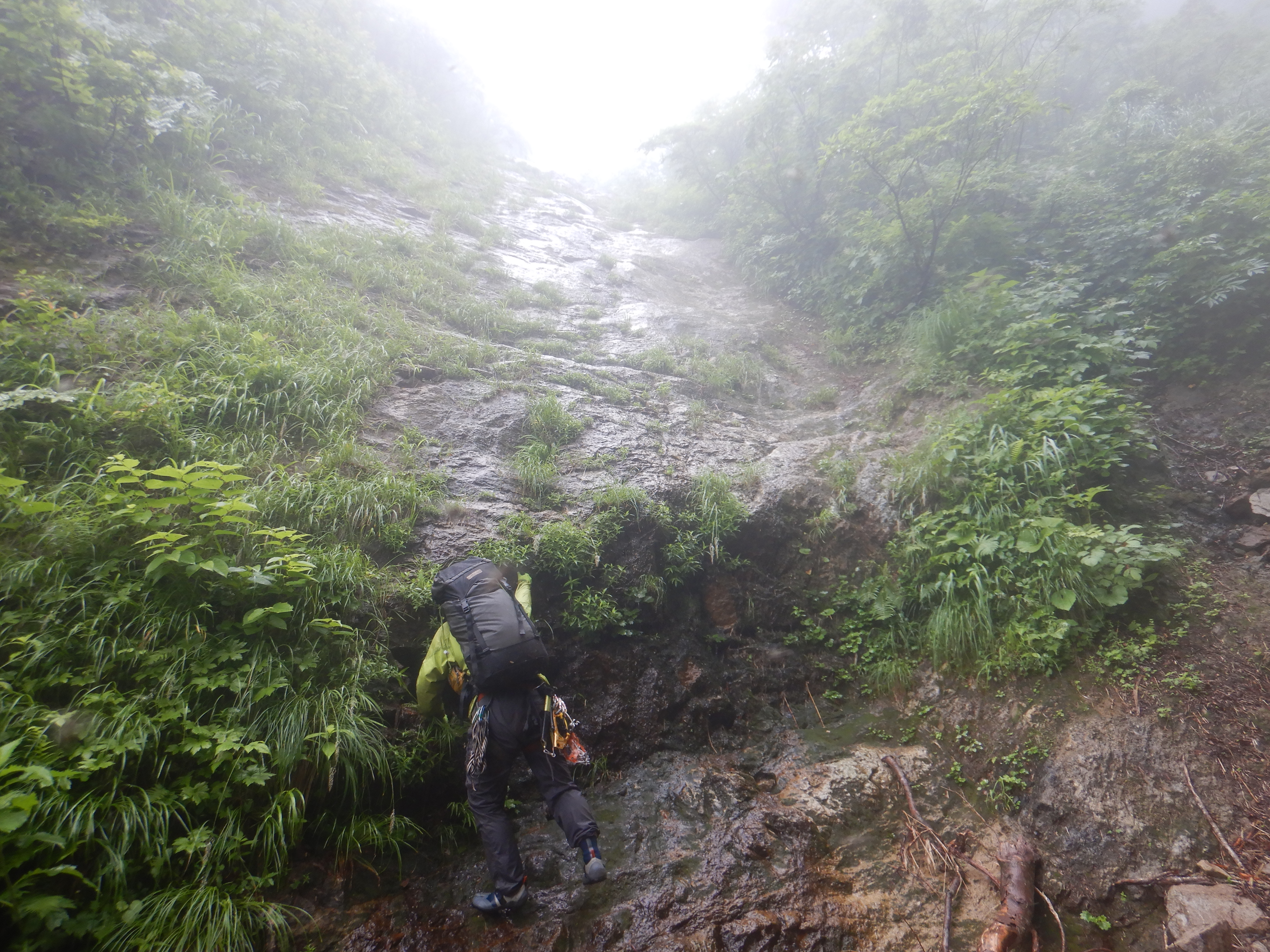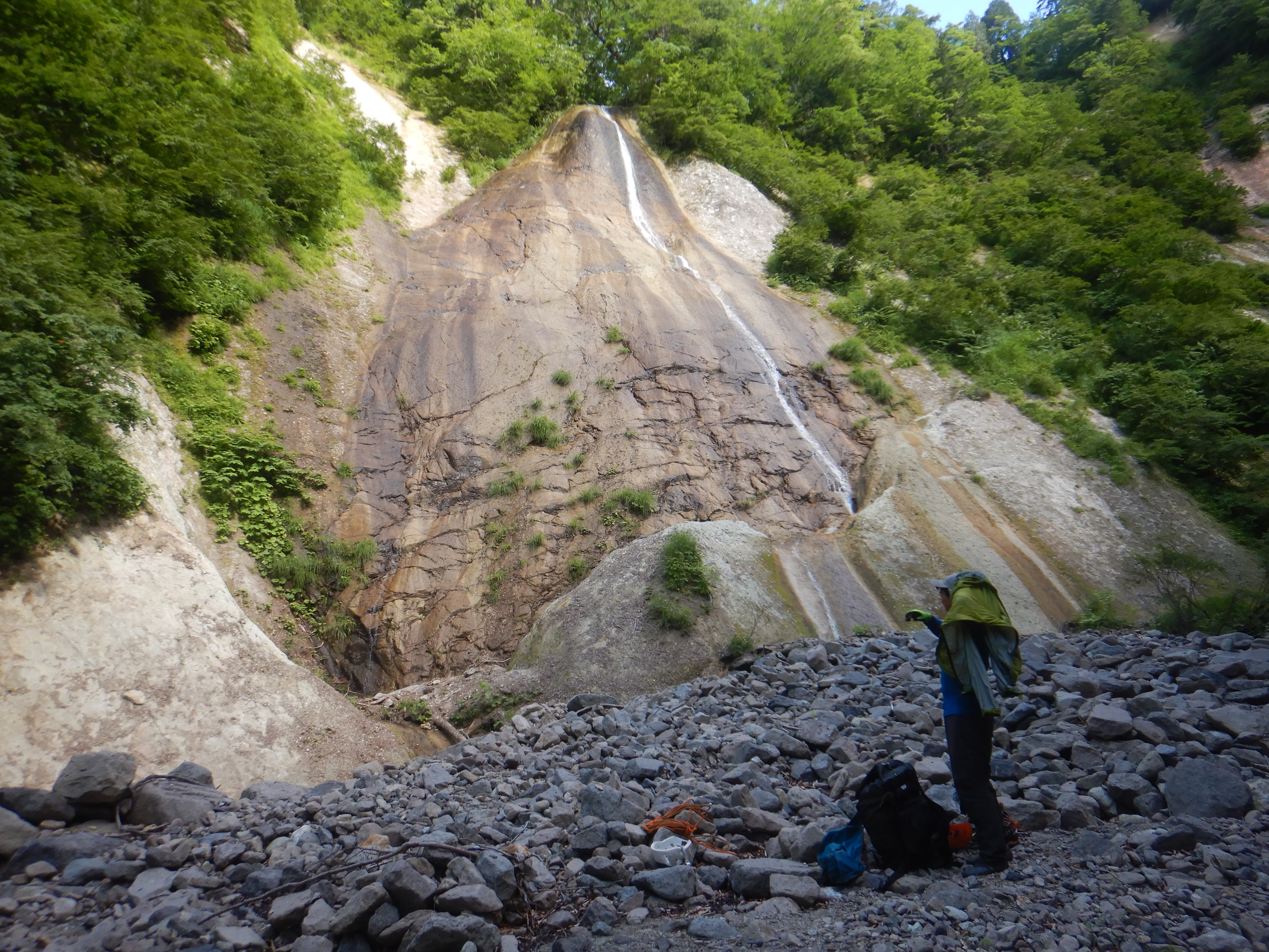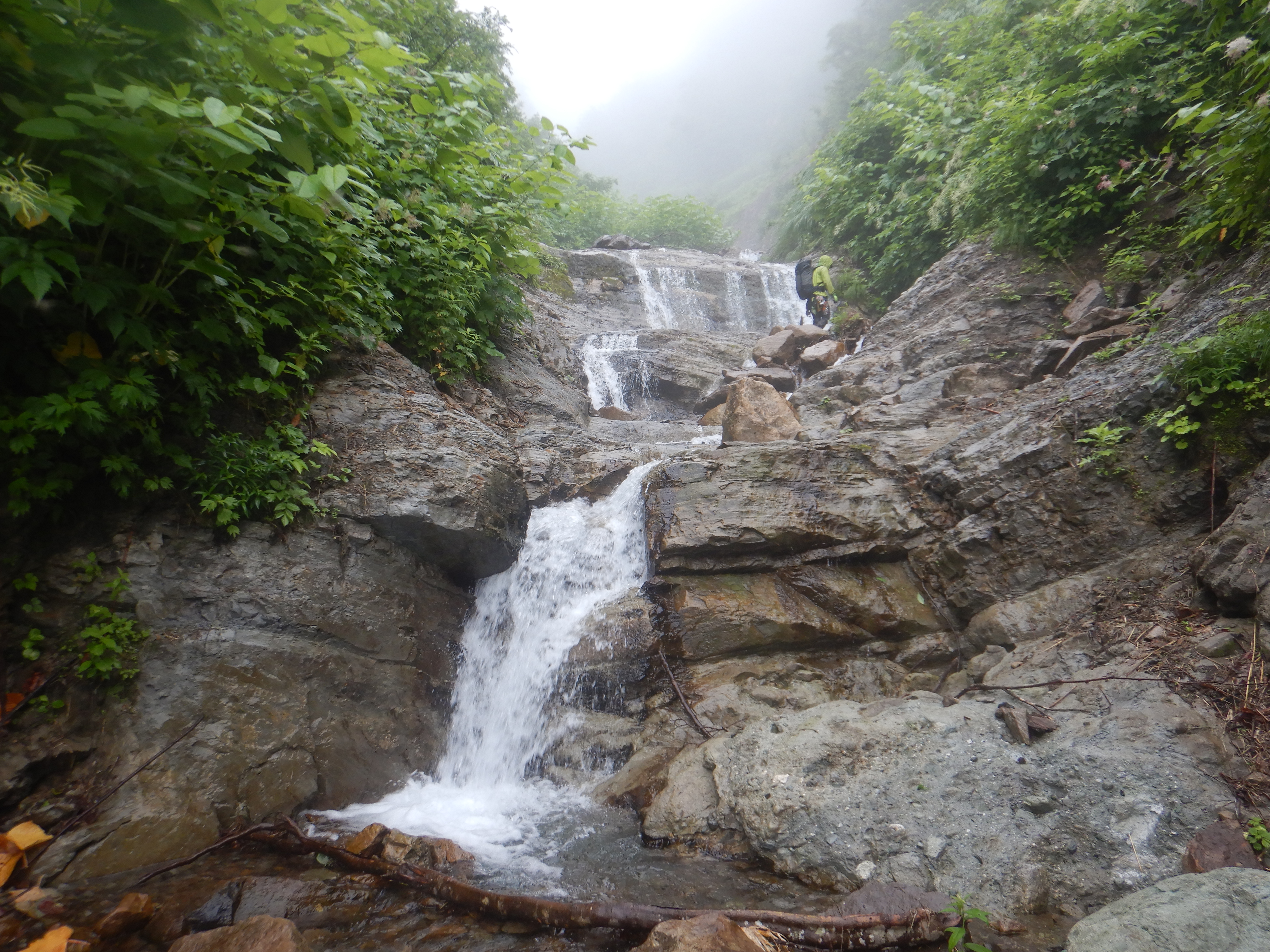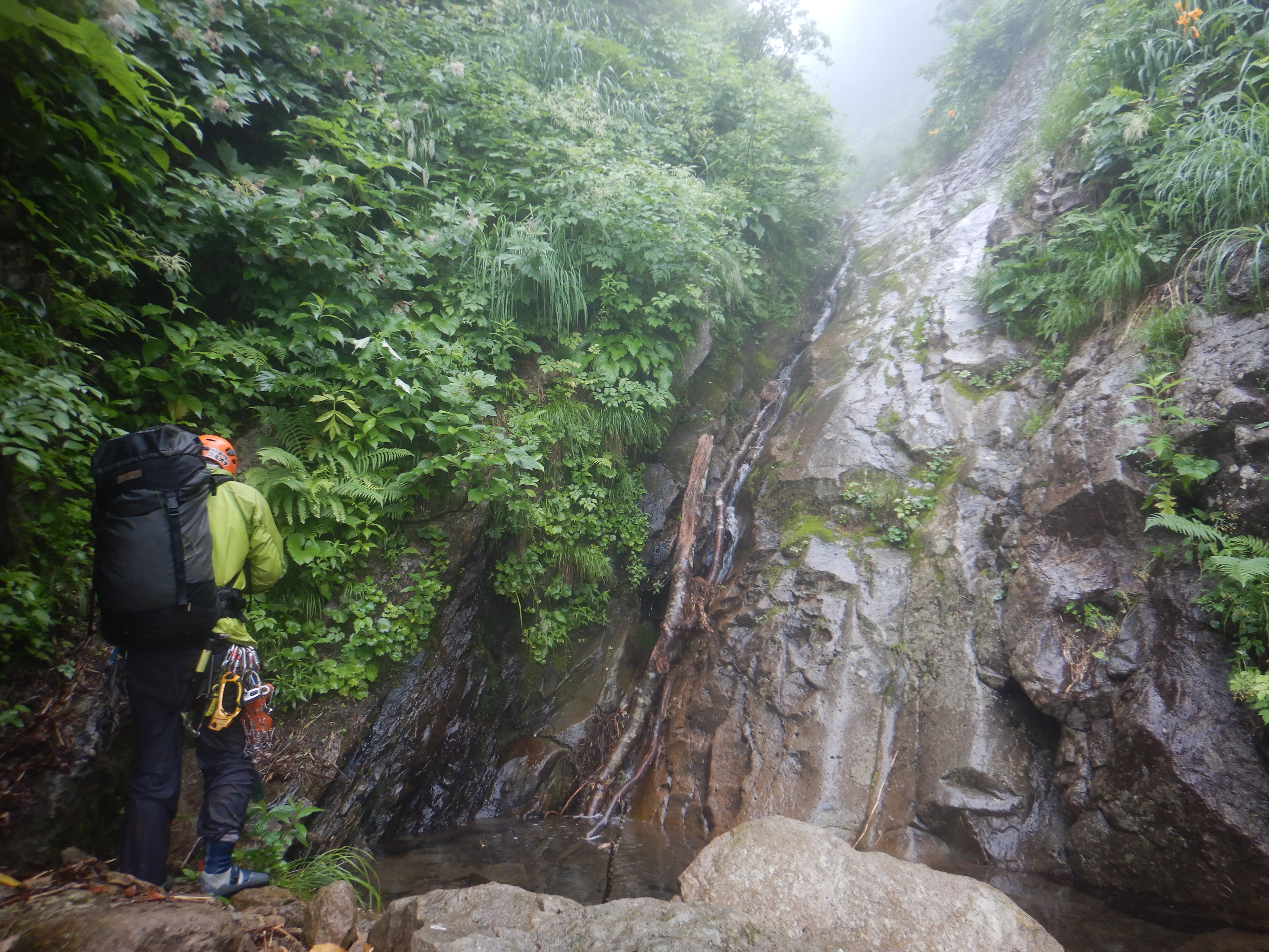 二俣にかかるナメ滝は傾斜が強く悪い。KCは巻いた。