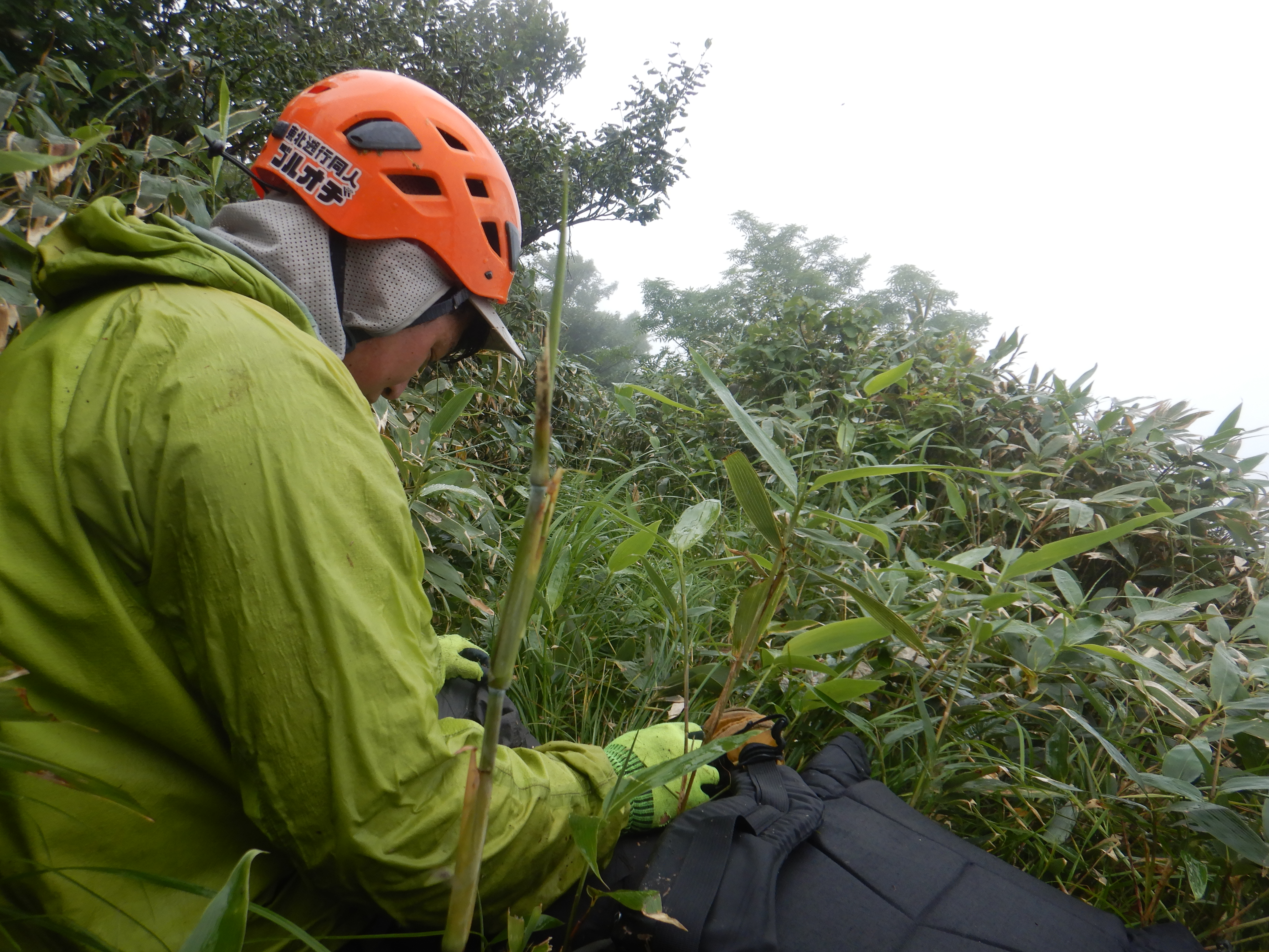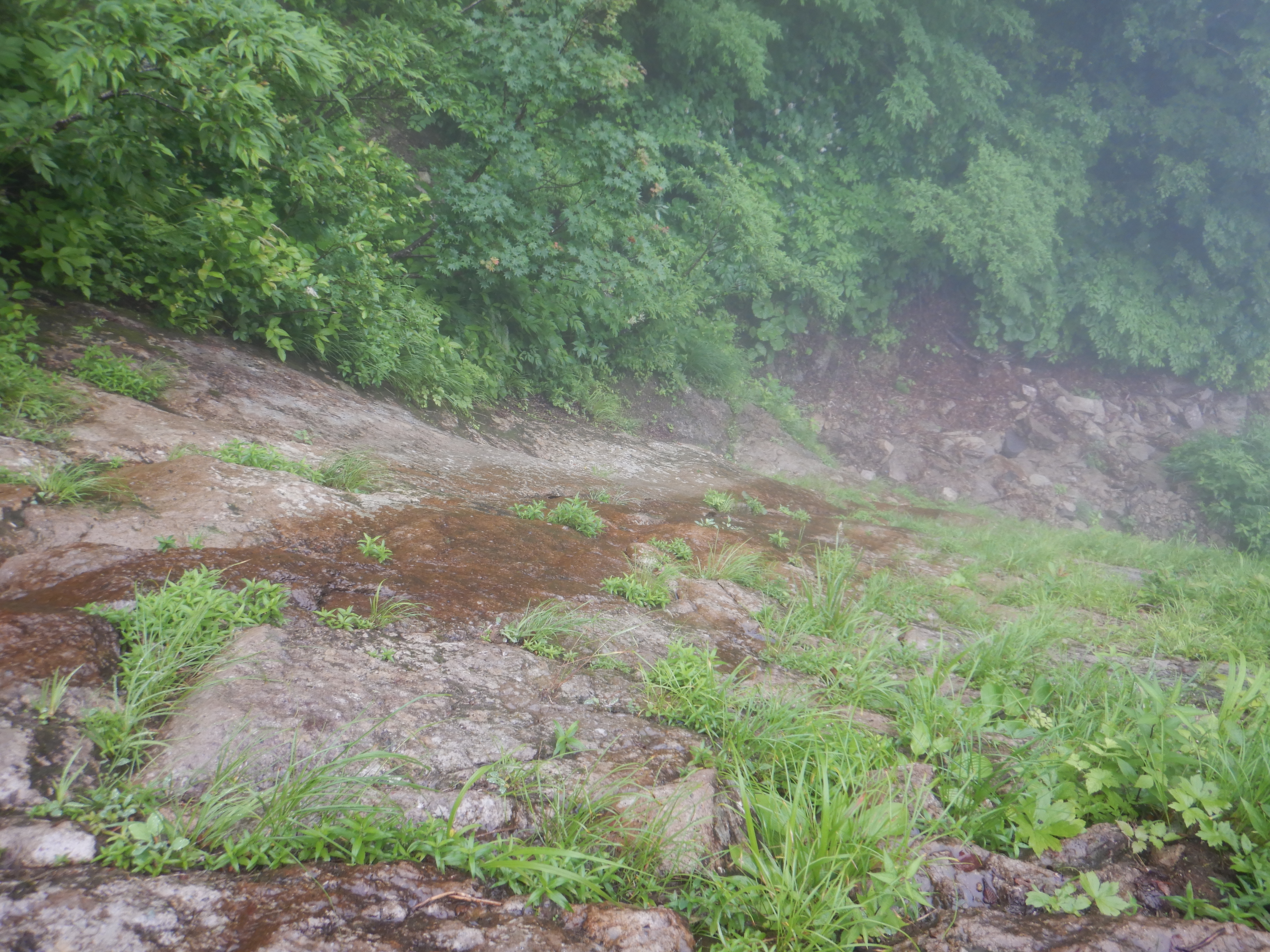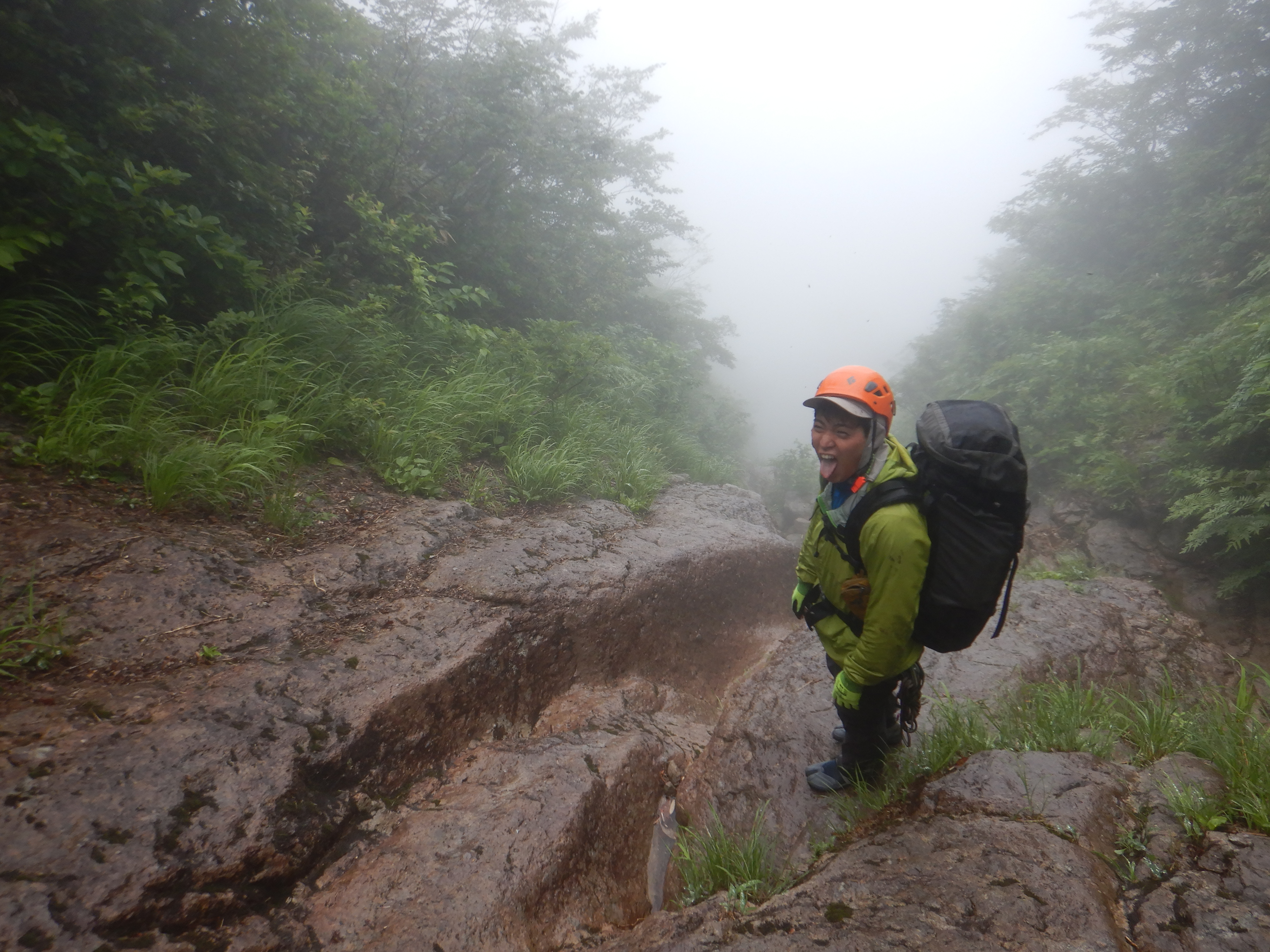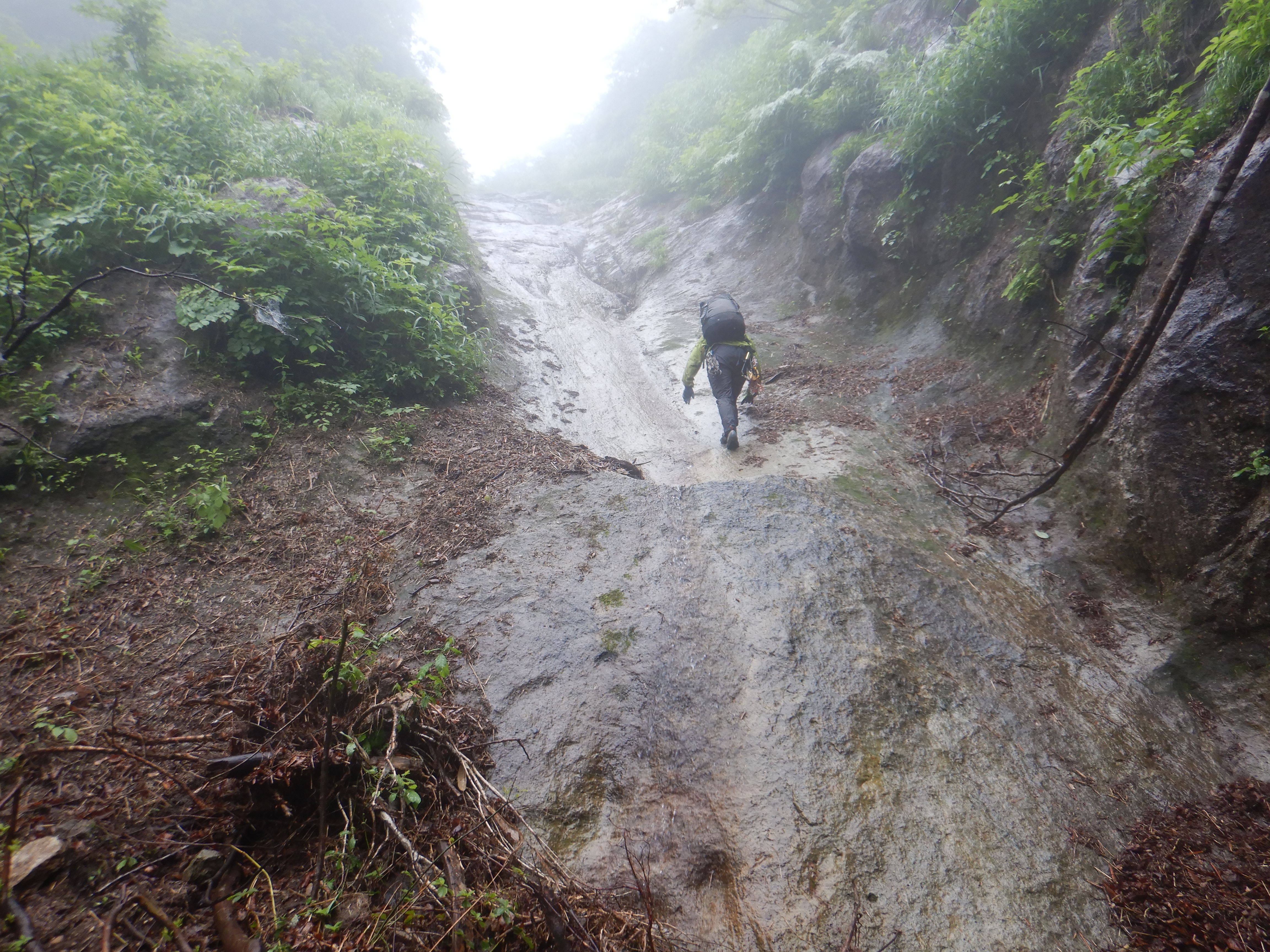 支流はナメが続く沢で特に難しい箇所は無かったが、最後に出てくるこのナメ滝だけ下るのが大変だった。藪を掴んでギリギリまで下りて最後は懸垂。ようやく万滝沢に入れた。