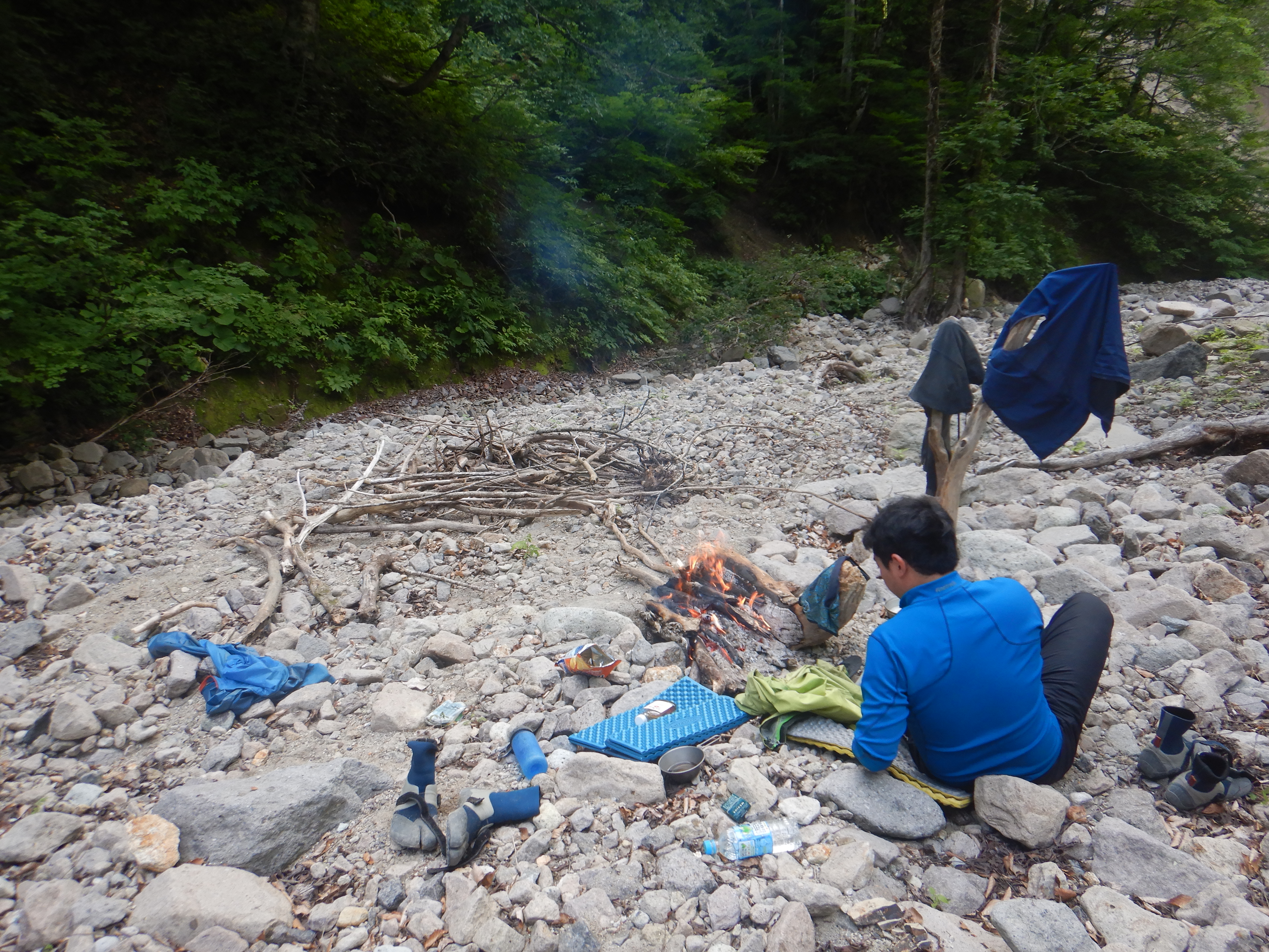 疲れ果てたので沢に着地した瞬間、即幕営!薪は無限でパリッパリに乾いていて盛大に焚火を楽しんだ。翌日の赤いゴルジュに続く。