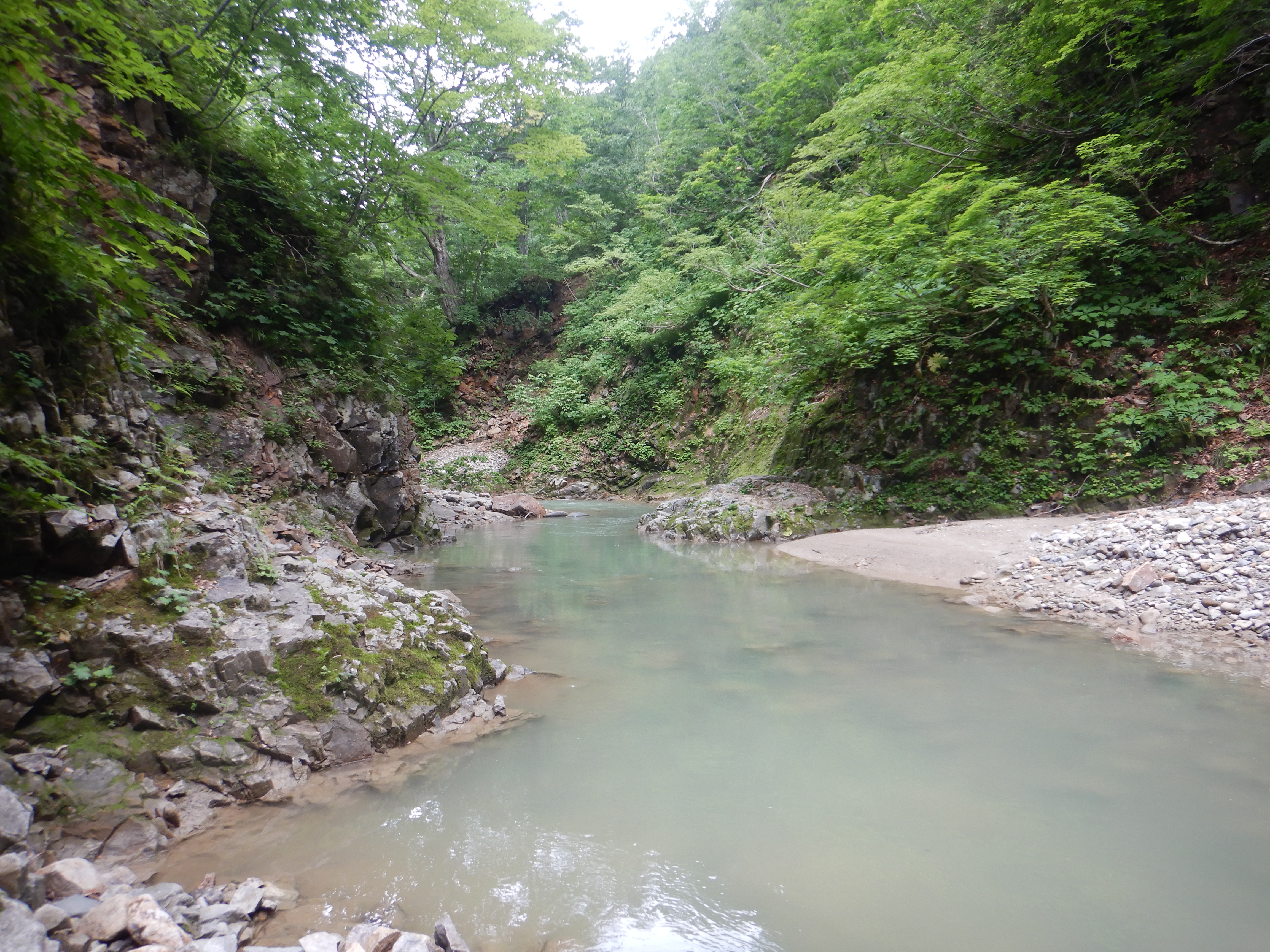 居なくなったので遡行再開。と思いきや、やっぱり水の色ヤバくない!?雪解けで濁っている感じでも無さそうだし、なんだろう。。