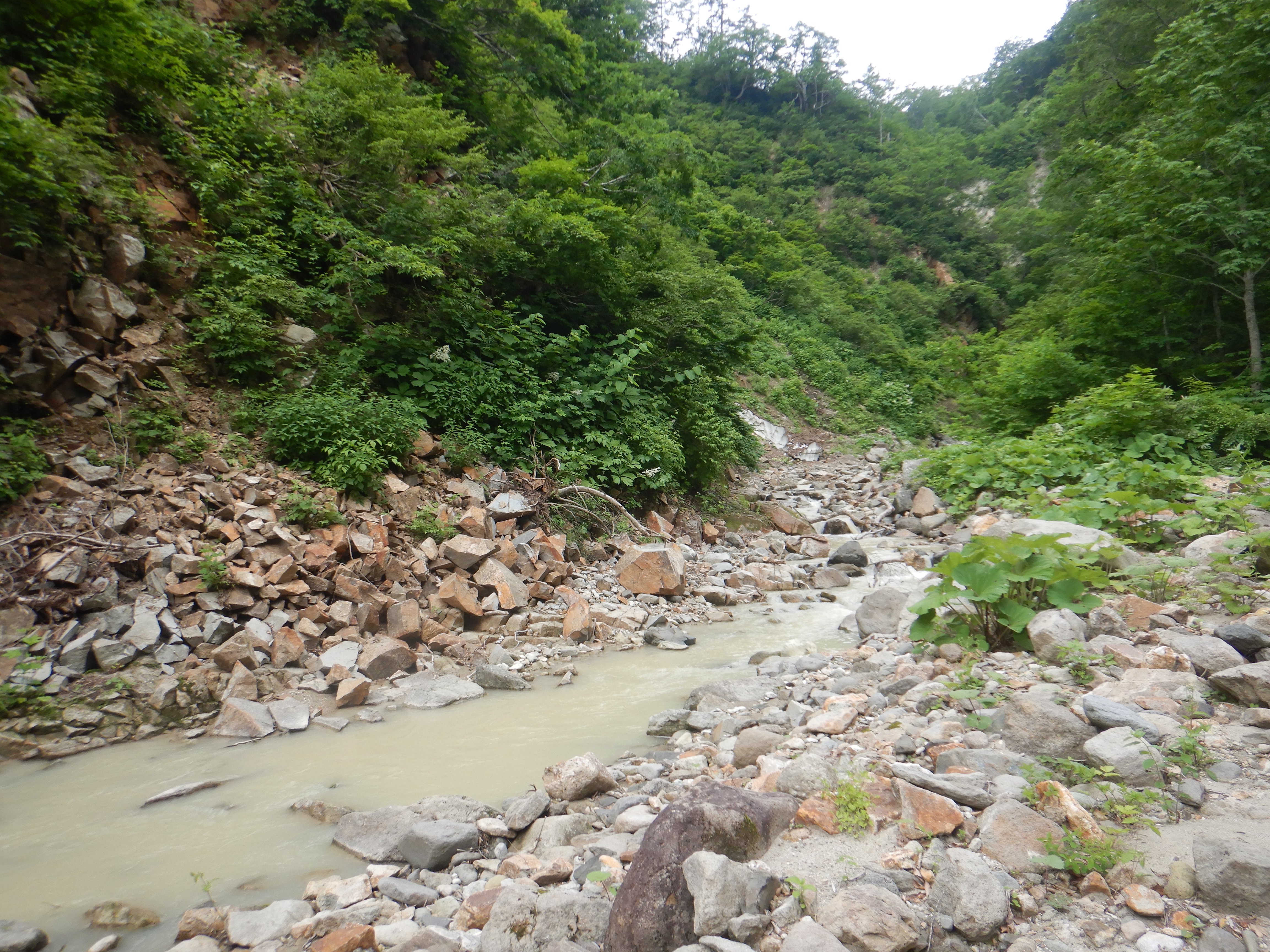 滝ノ又沢出合。序盤から続く濁りの正体はこの沢が原因だったようだ…。少し覗いて見ると斜面が崩壊している箇所があって、そこから濁った水が流れ出ていた。
