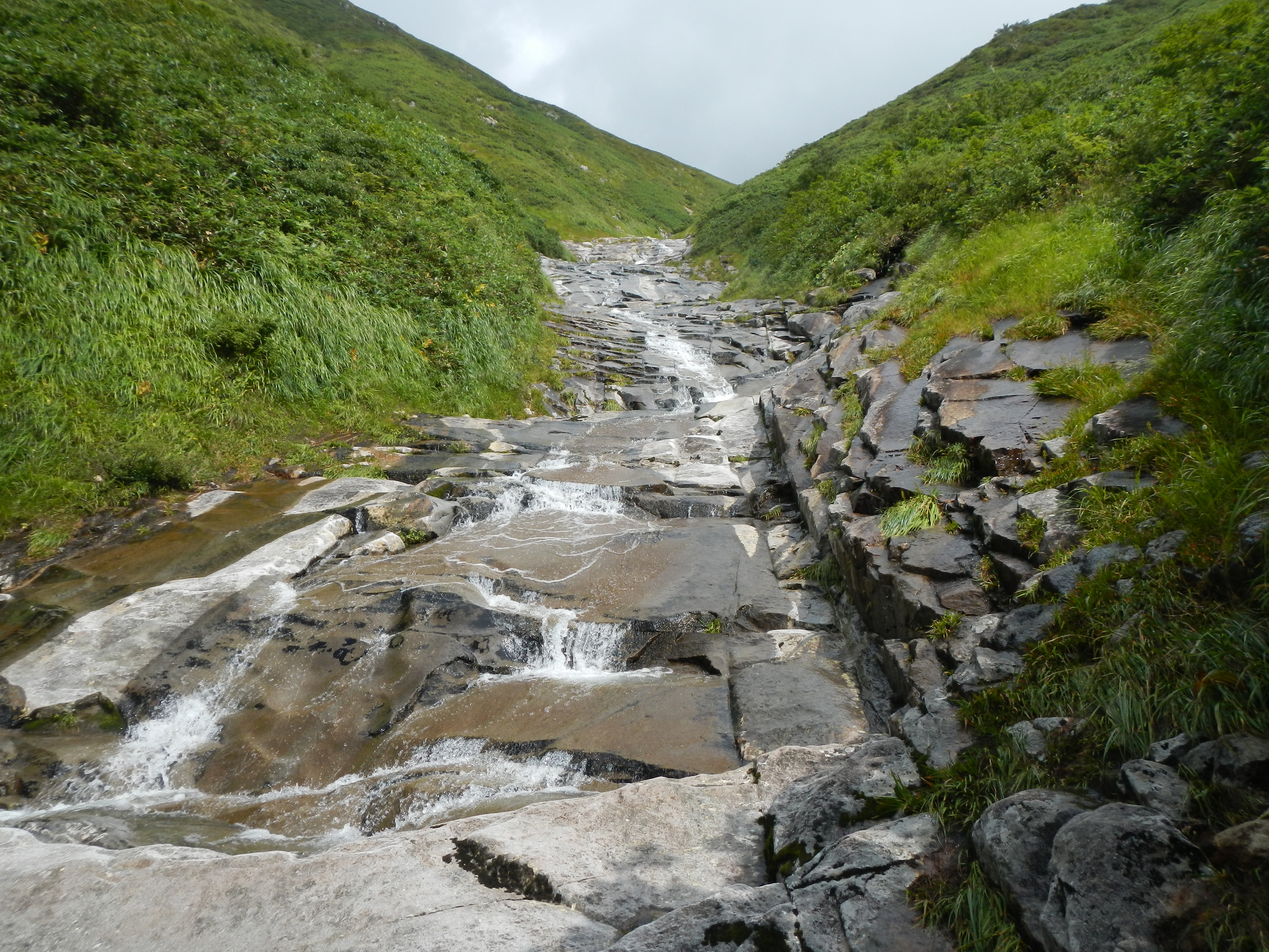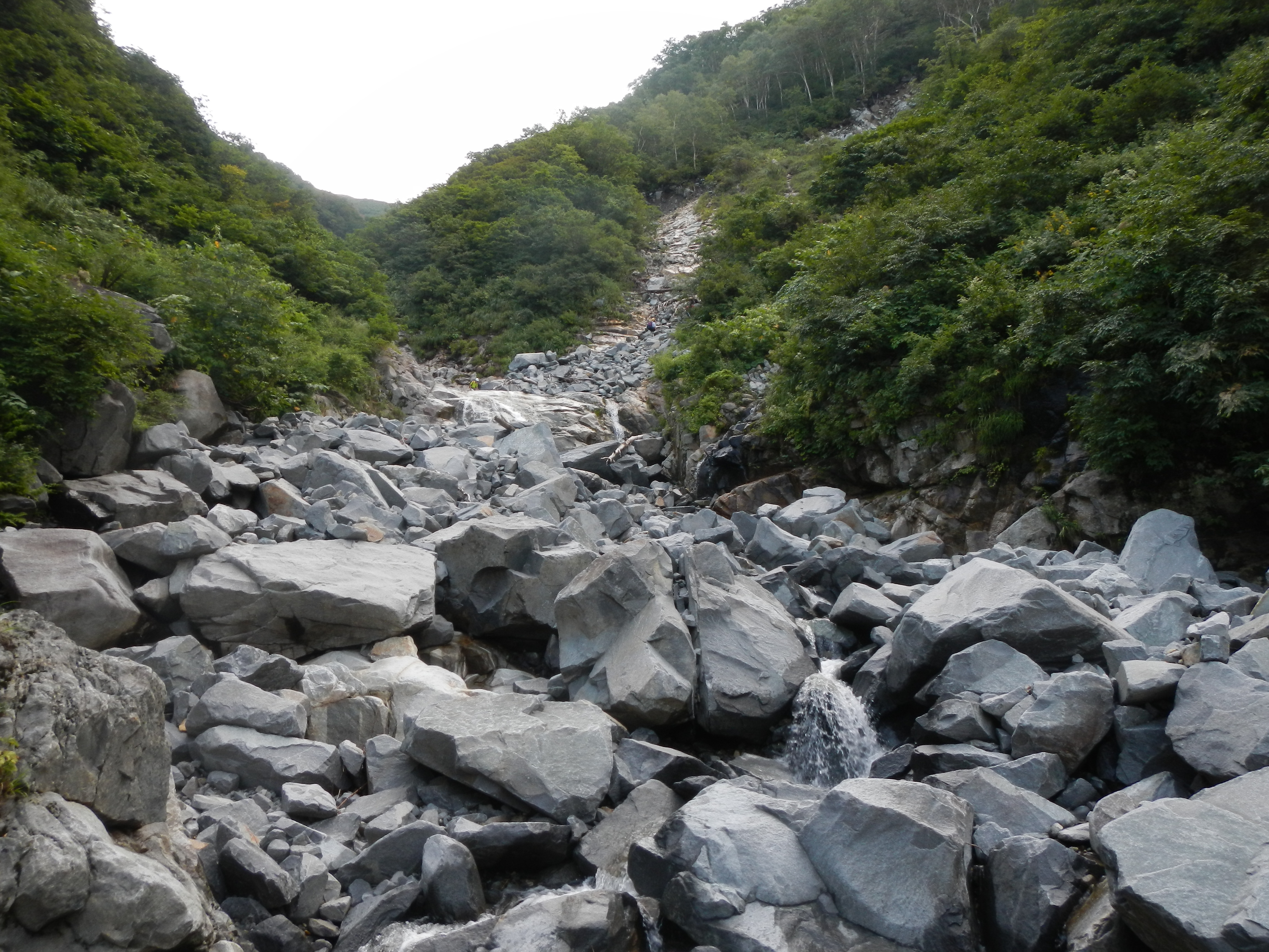 駐車場6:30-入渓地点6:40-源頭部のナメ10:30-登山道12:30-巻機山13:00-駐車場16:00
