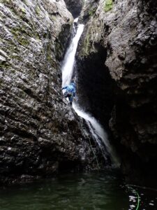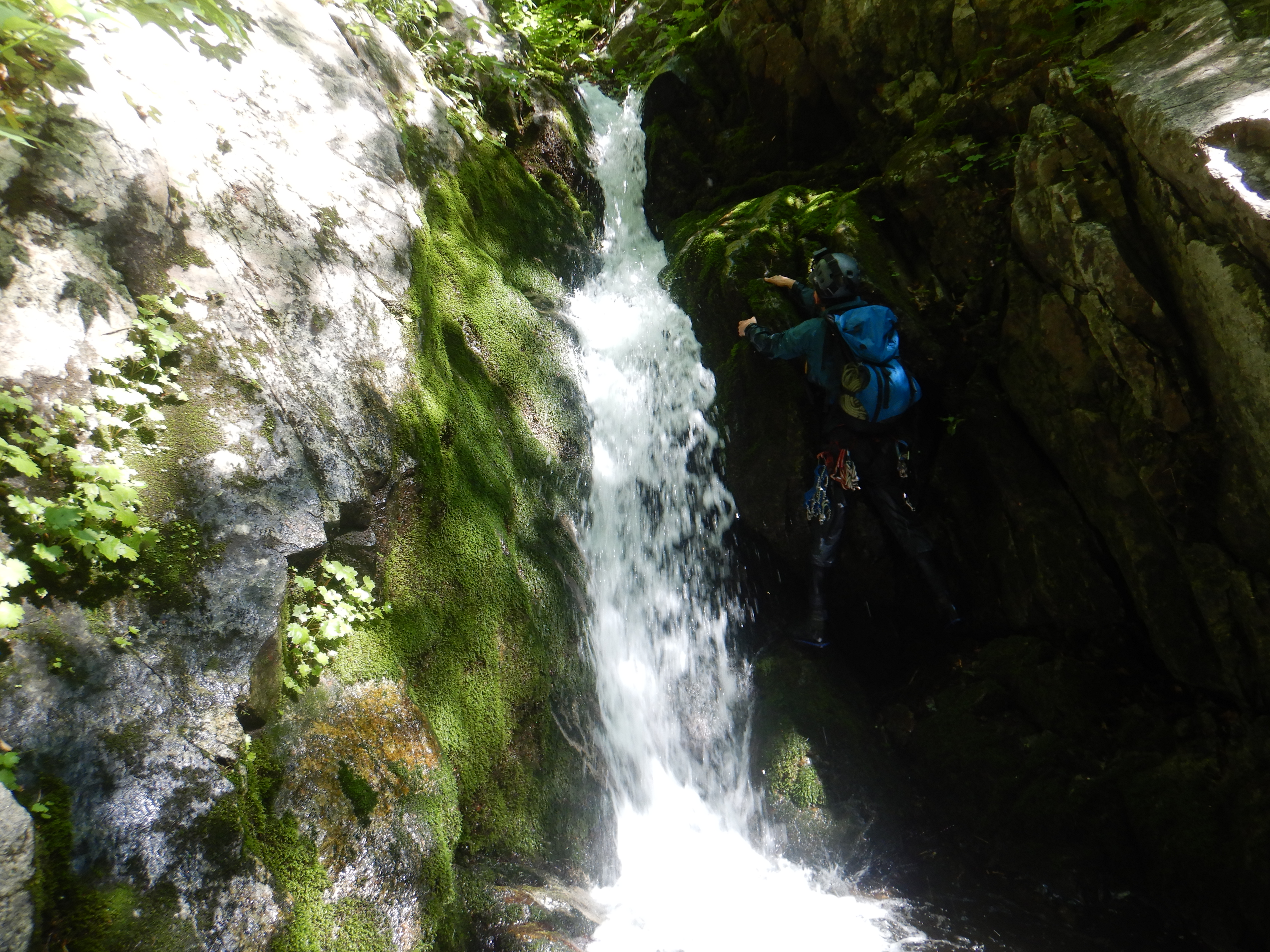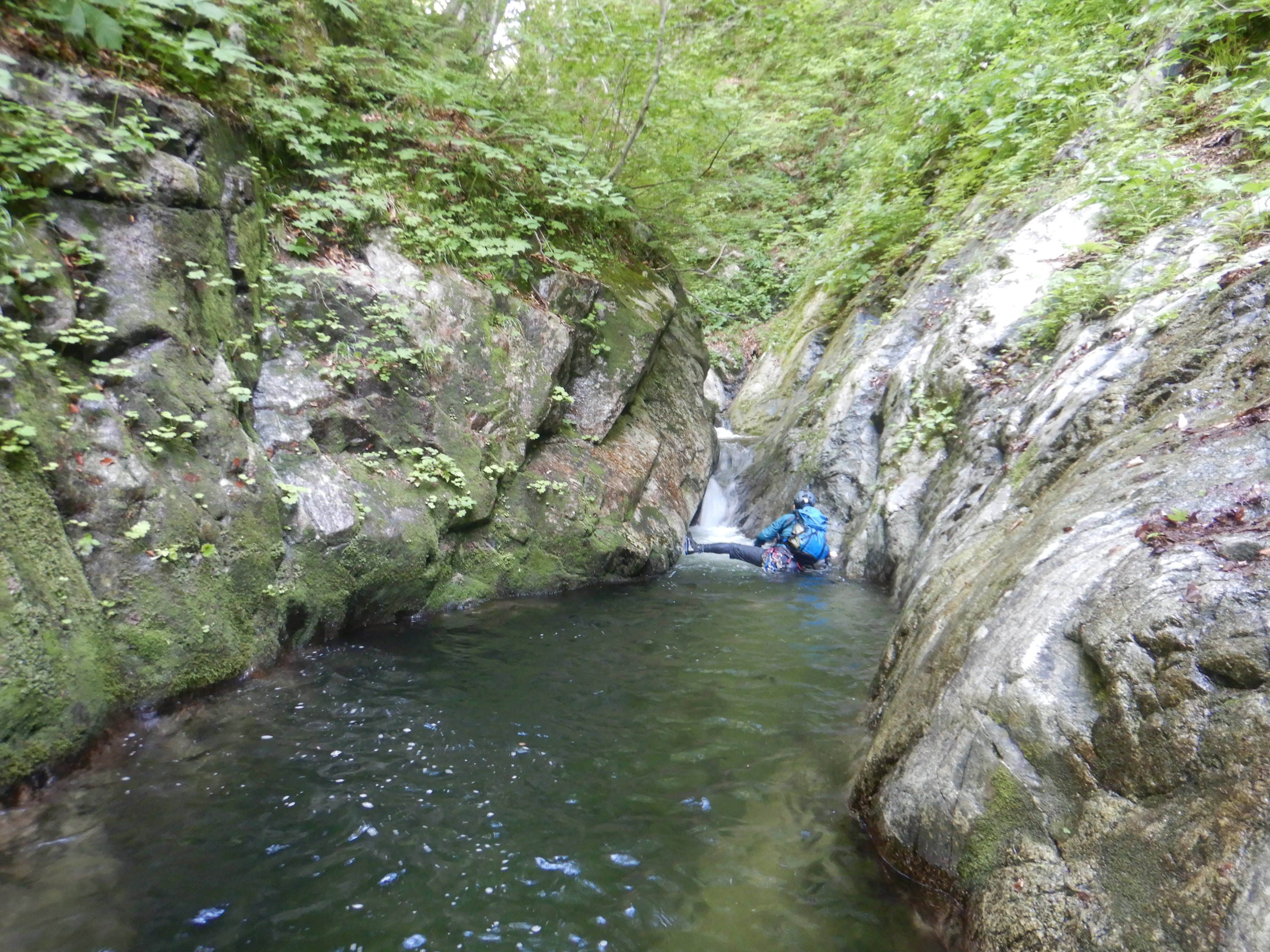 ゴルジュは泳ぐ。右のスラブに残置ロープがあるらしいが、泳いだ方が早い。