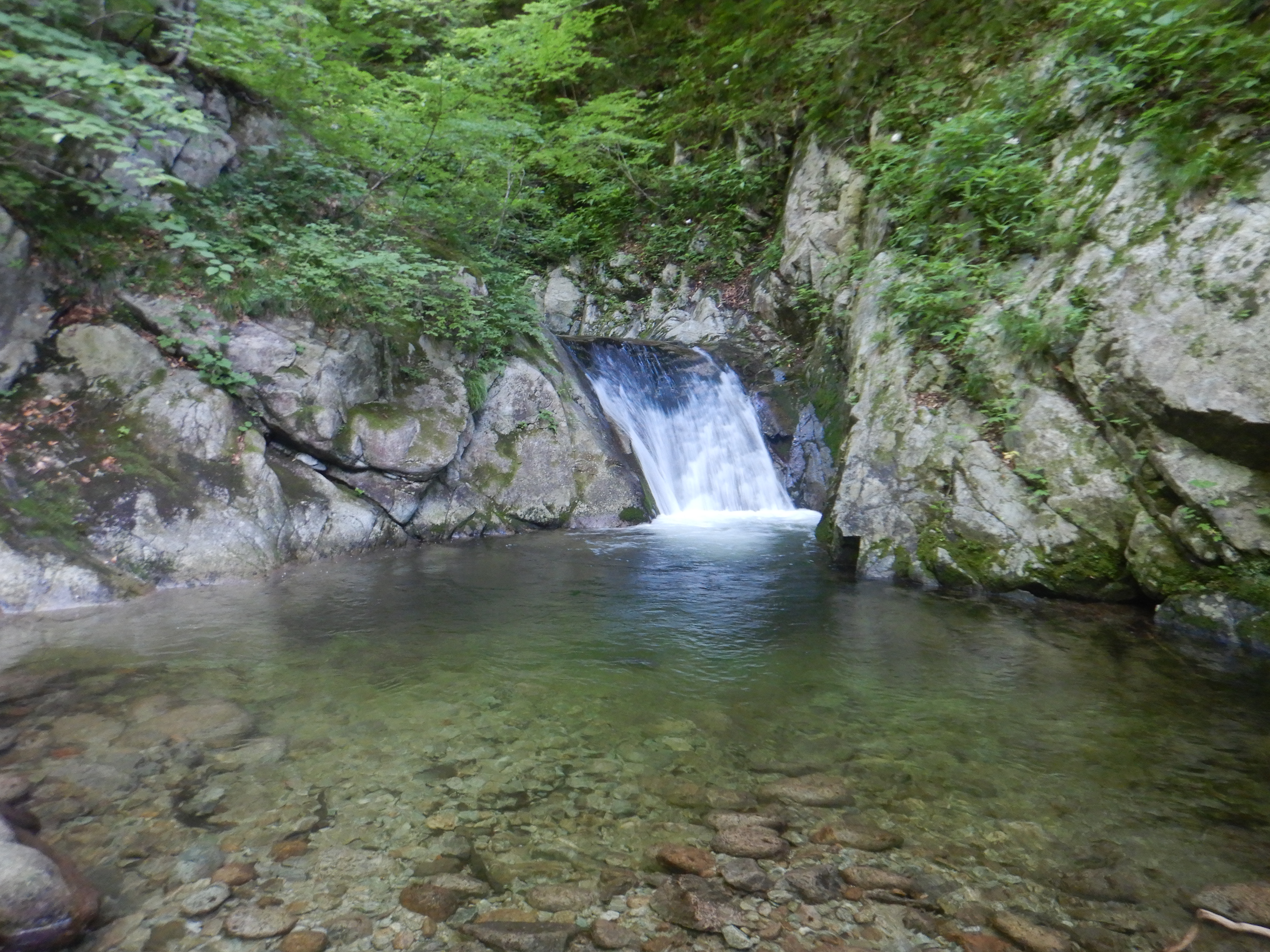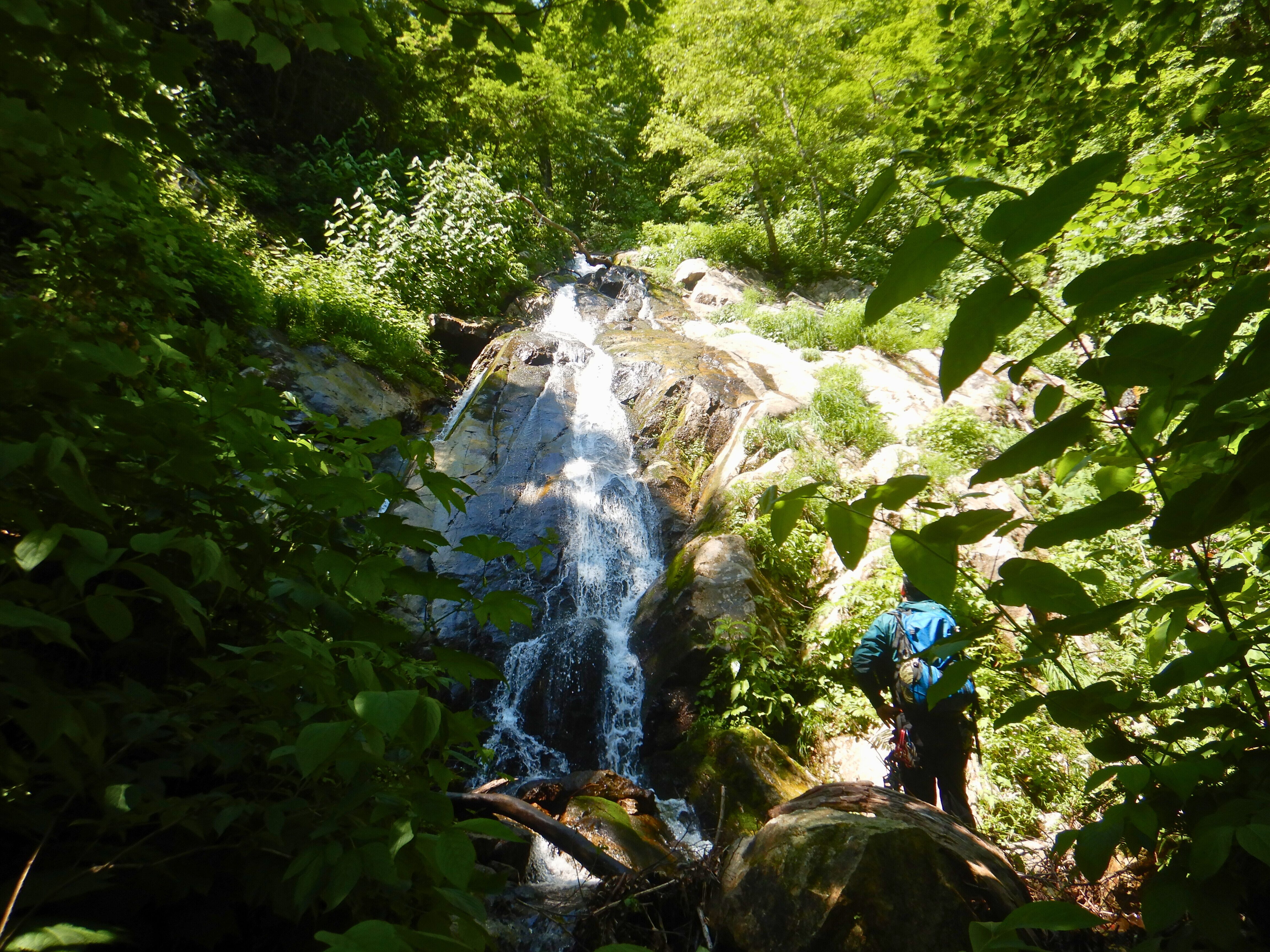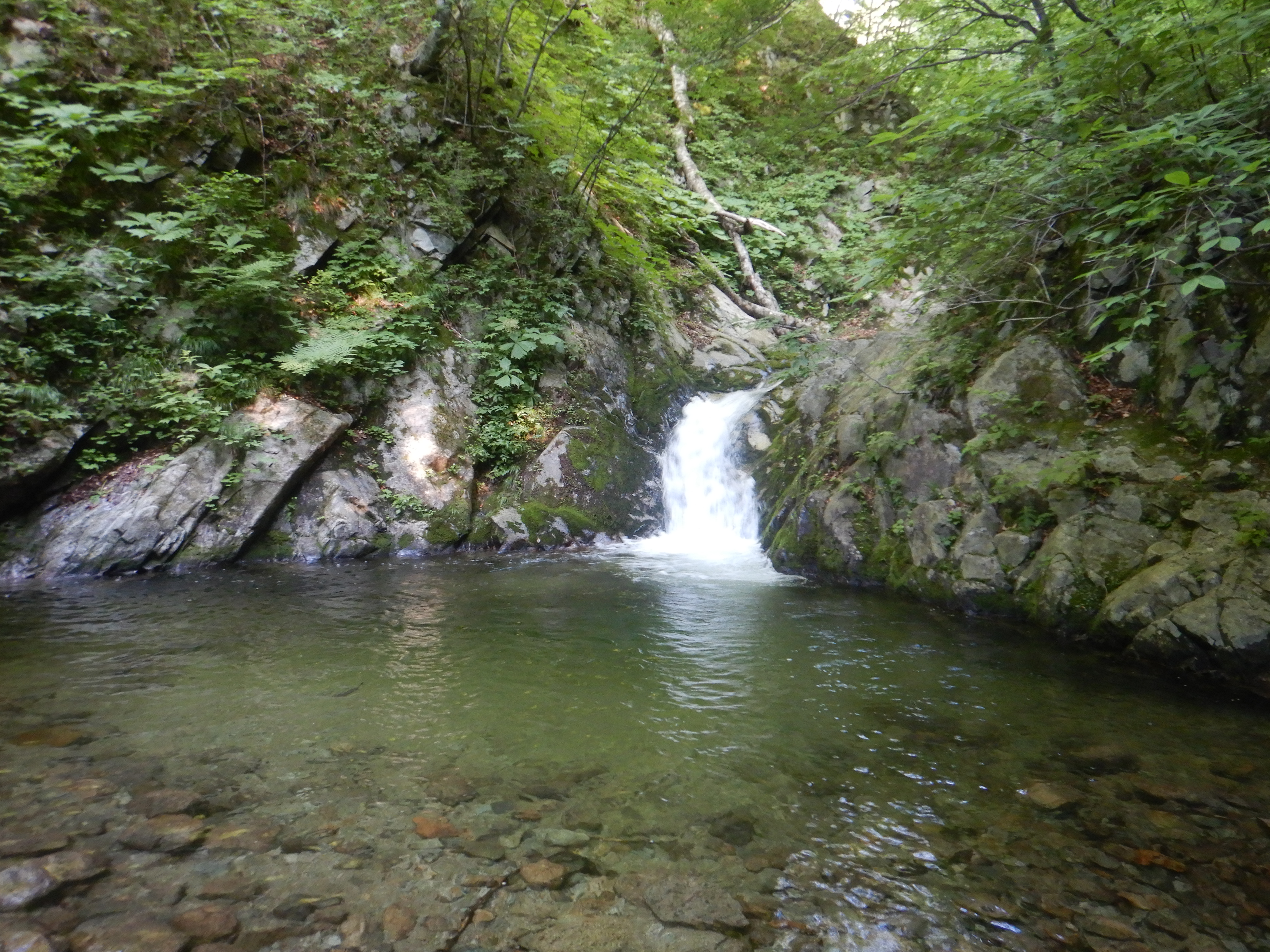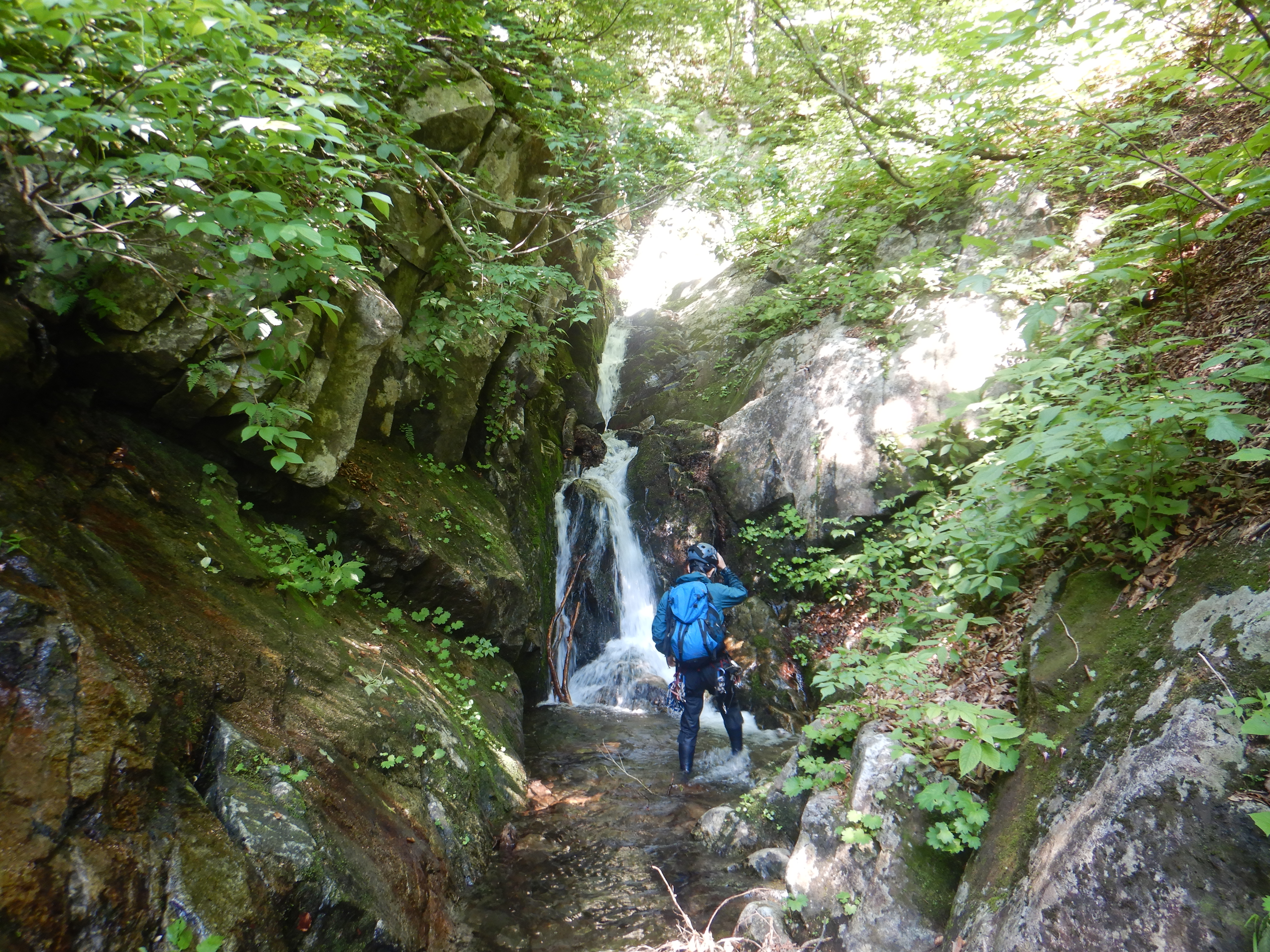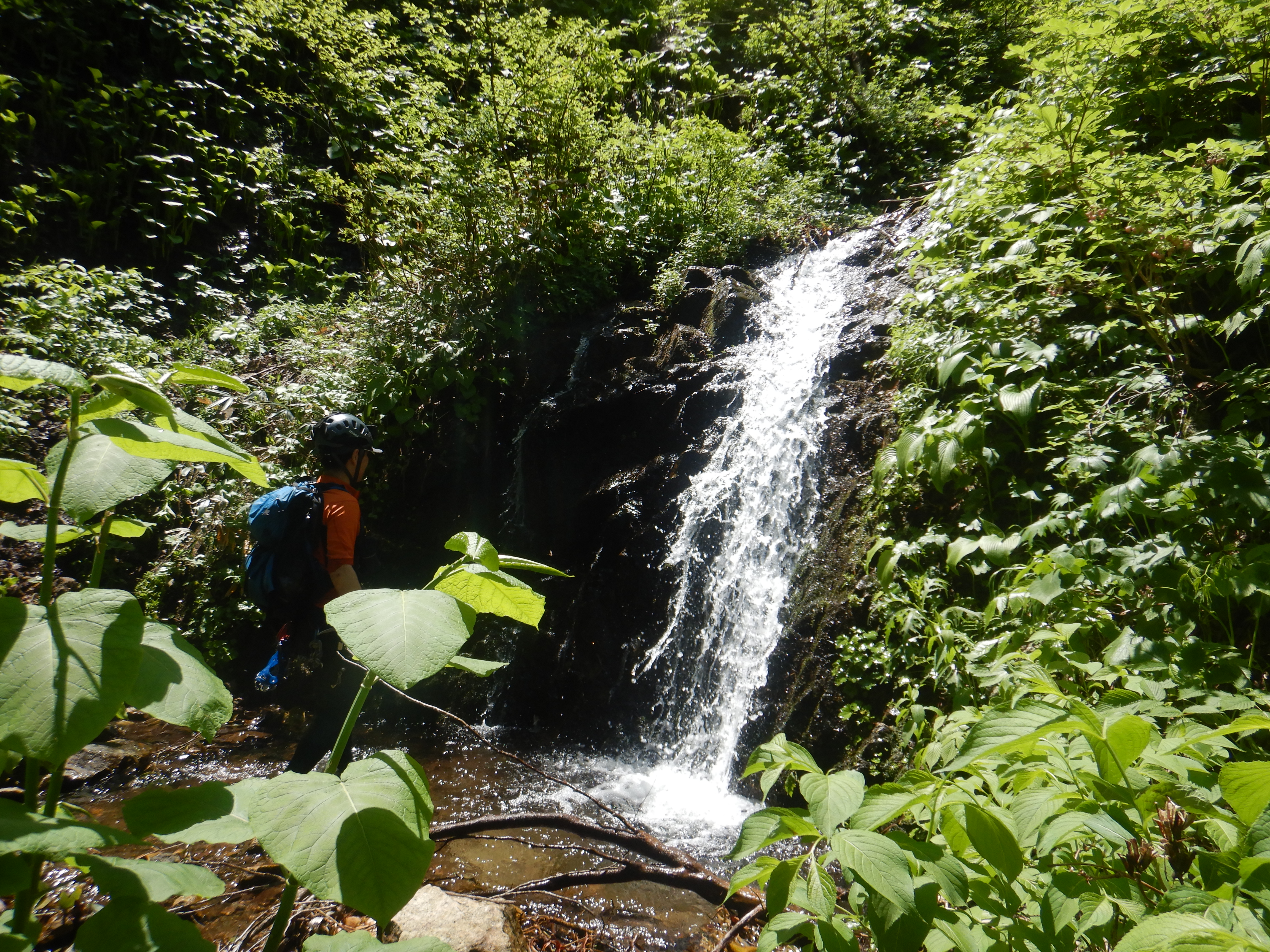 その後も小滝が続いて夢中で登っていると登山道に抜けた。クマに遭遇しつつ、人がいない登山道を歩いて峩々温泉へと下山。