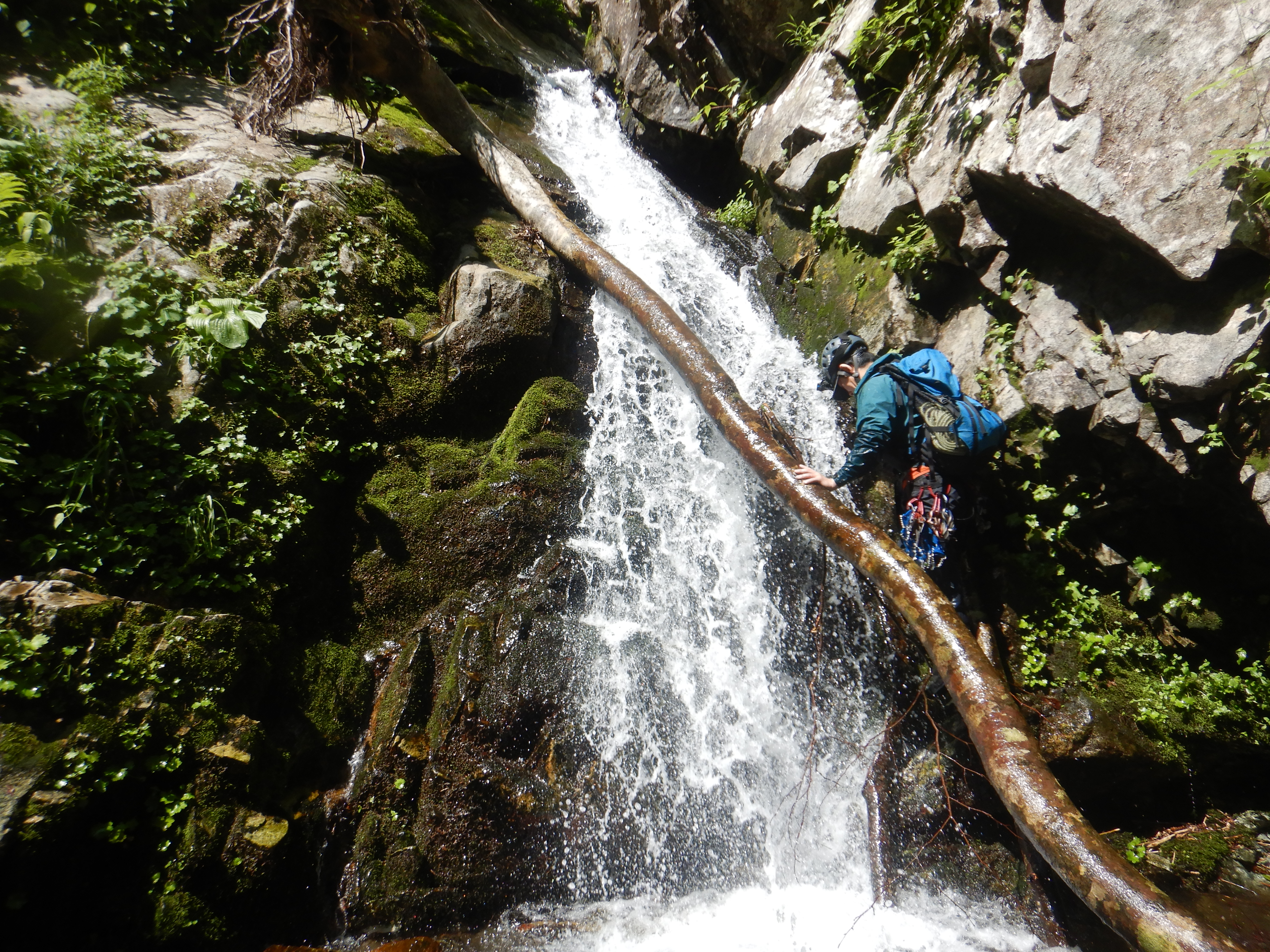 右の乾いたところを適当に登るが、意外と滑ってヒヤヒヤ…。ヌメリでもないこの絶妙にフリクションが利かない感じは何なのか。慎重に登って上部は巻いて落ち口へ。