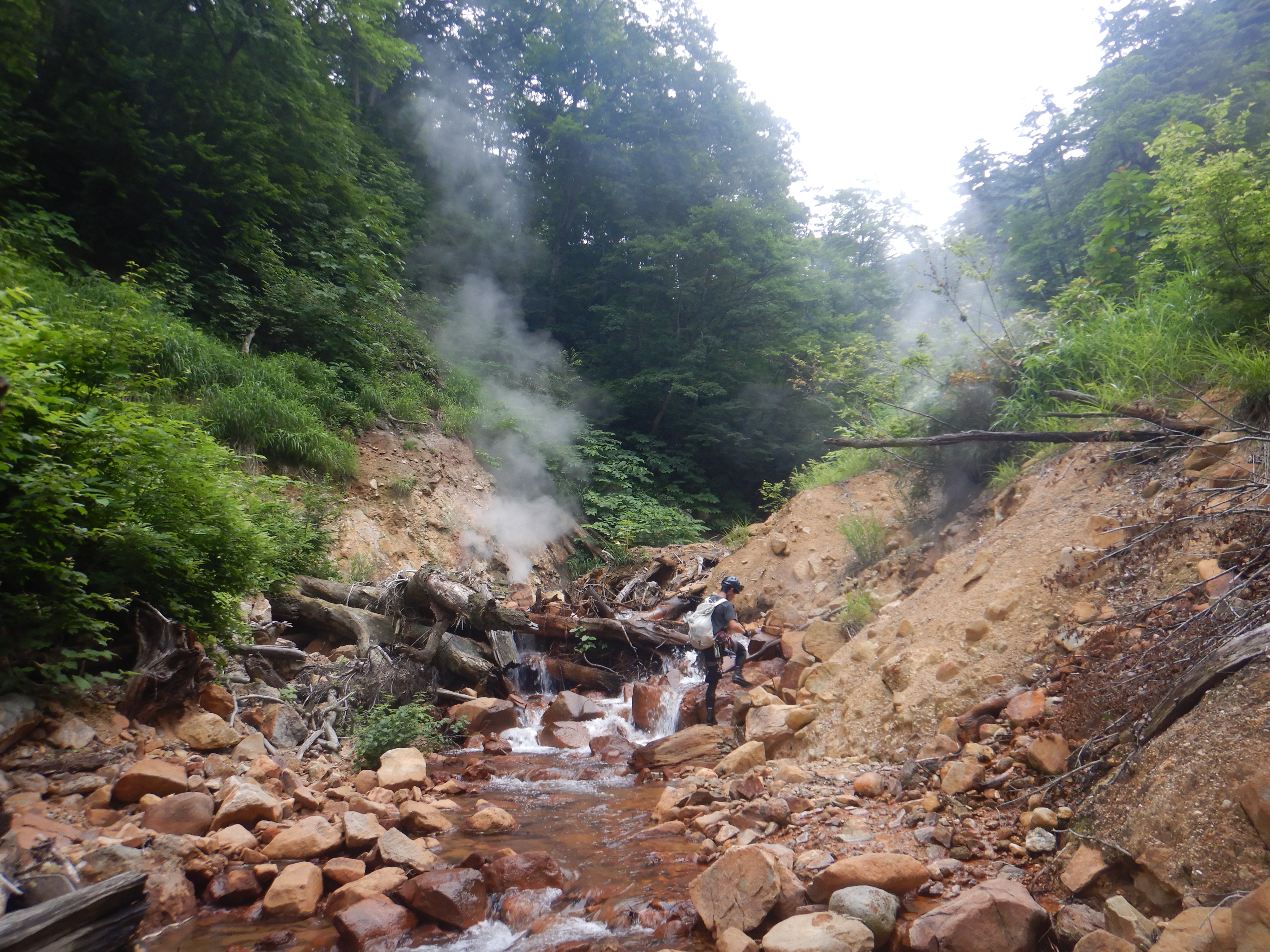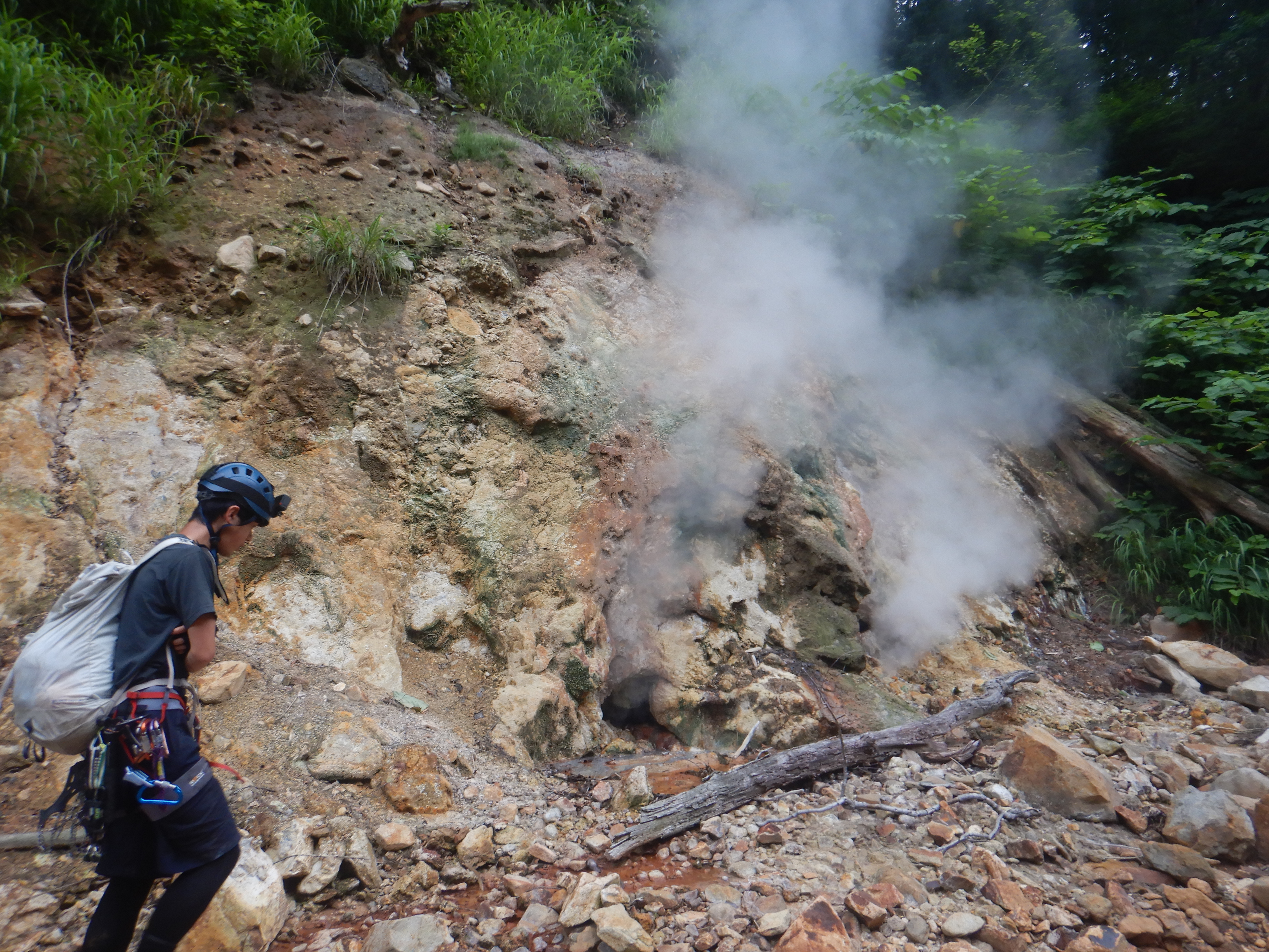 なぜこの沢を選んだか?それは温泉が湧いている珍しい沢だから!入渓すると地表から煙がモクモクと湧いている。