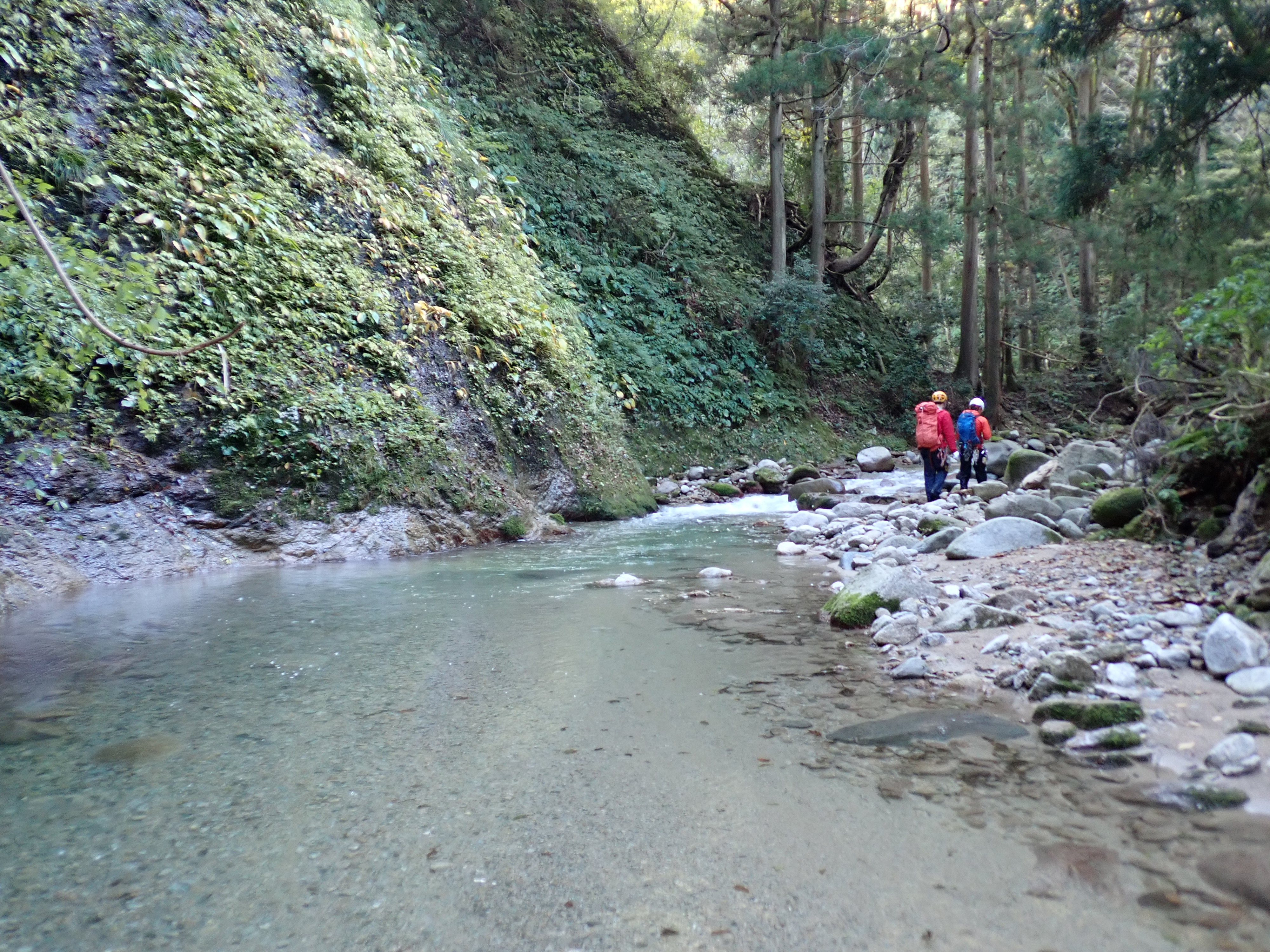 早朝の気温は何と3℃!もう沢登りが出来る気温ではない。全身ガチ装備で固めて出発する。新保川は無駄に綺麗。