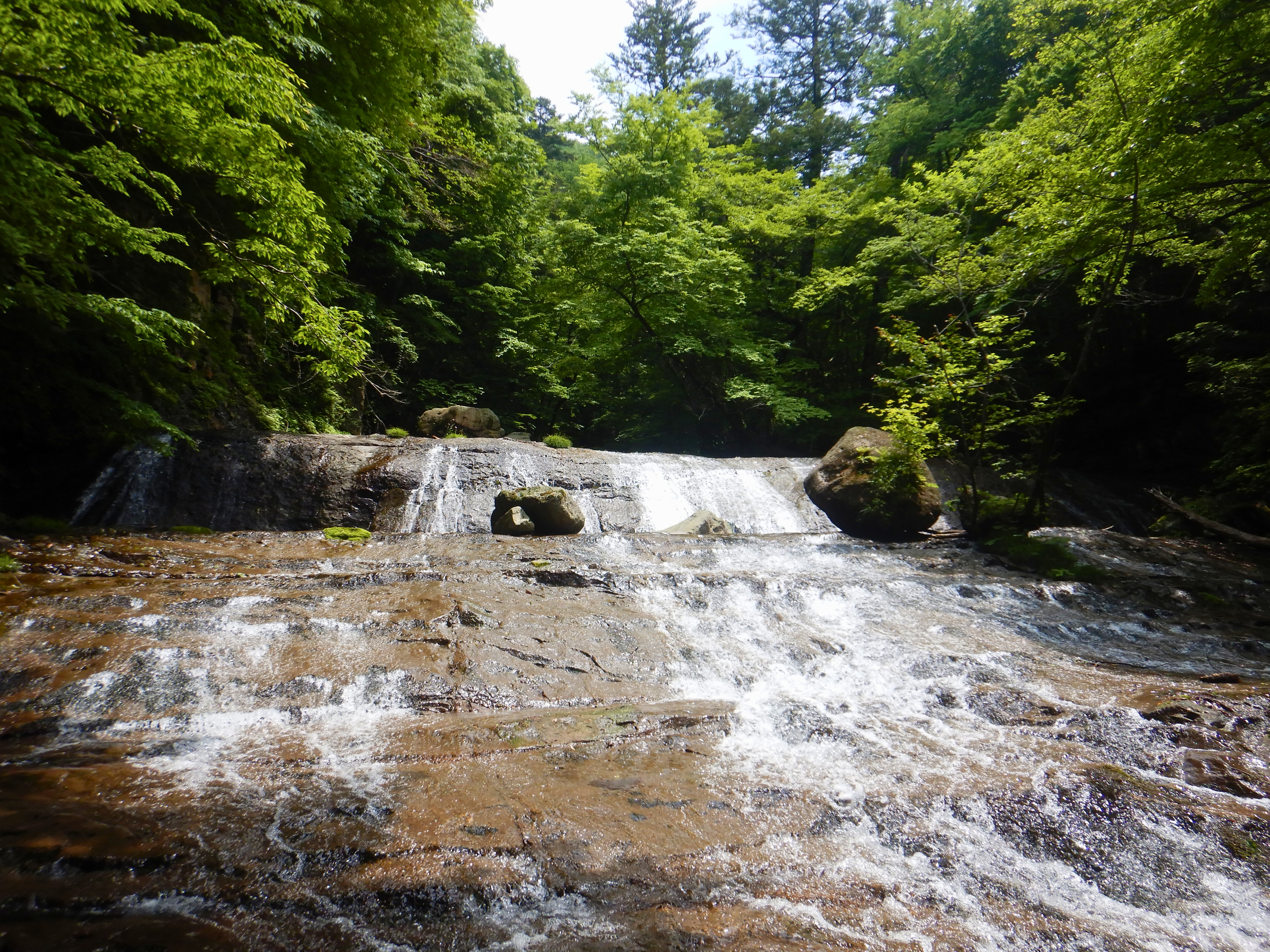 スッカン沢に比べると美しいナメや滝が出てきてハッピー。おしらじの滝までは我慢のゴーロ歩きとなる。2種類の系統の違った沢を楽しめる貴重な沢で初心者におすすめ。