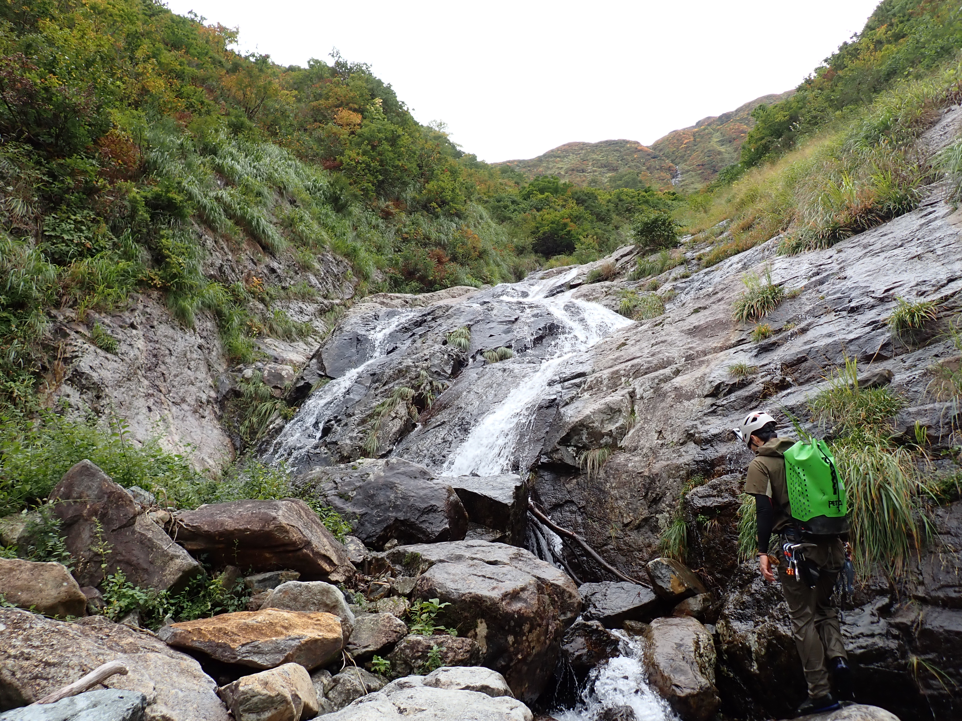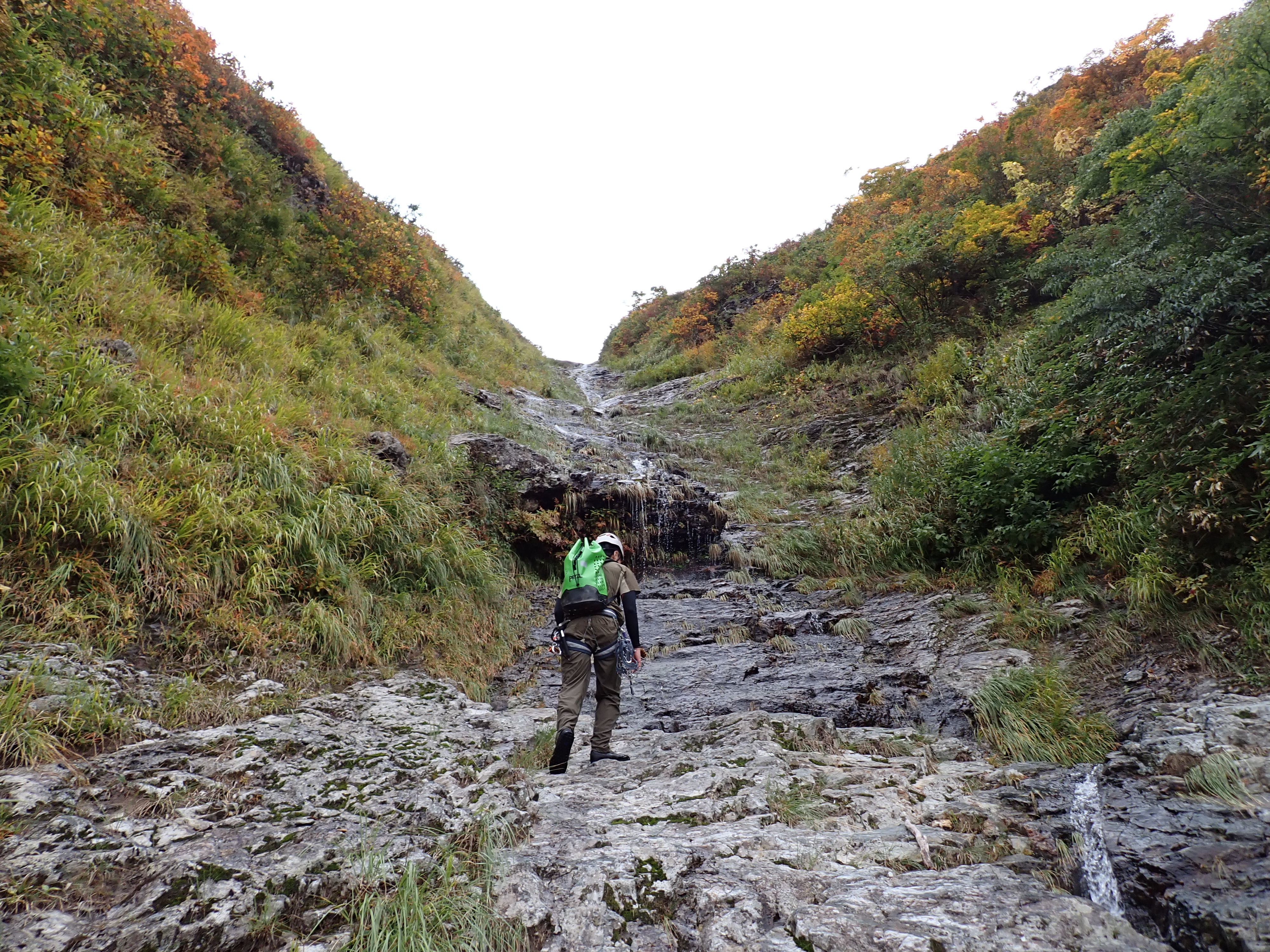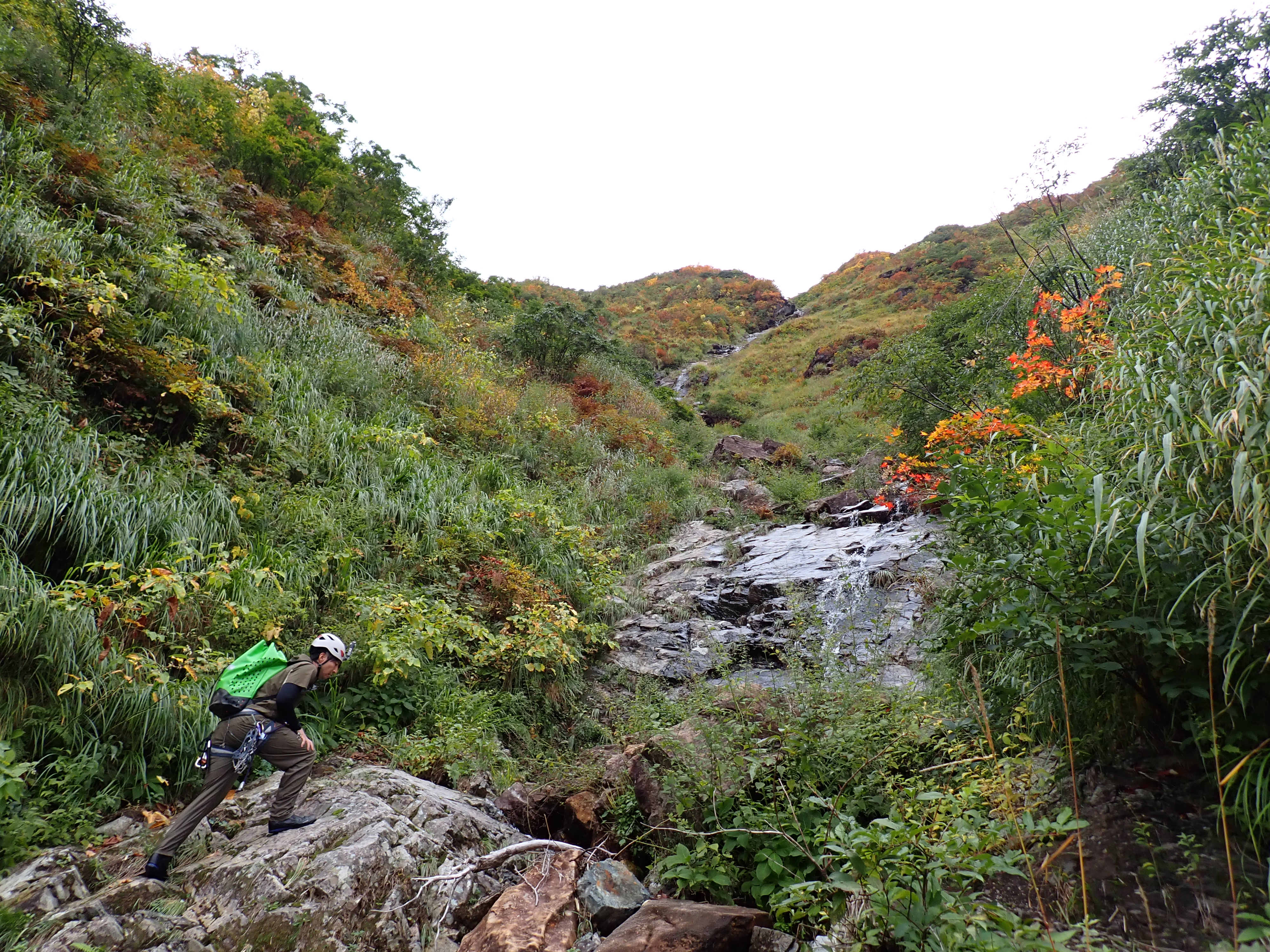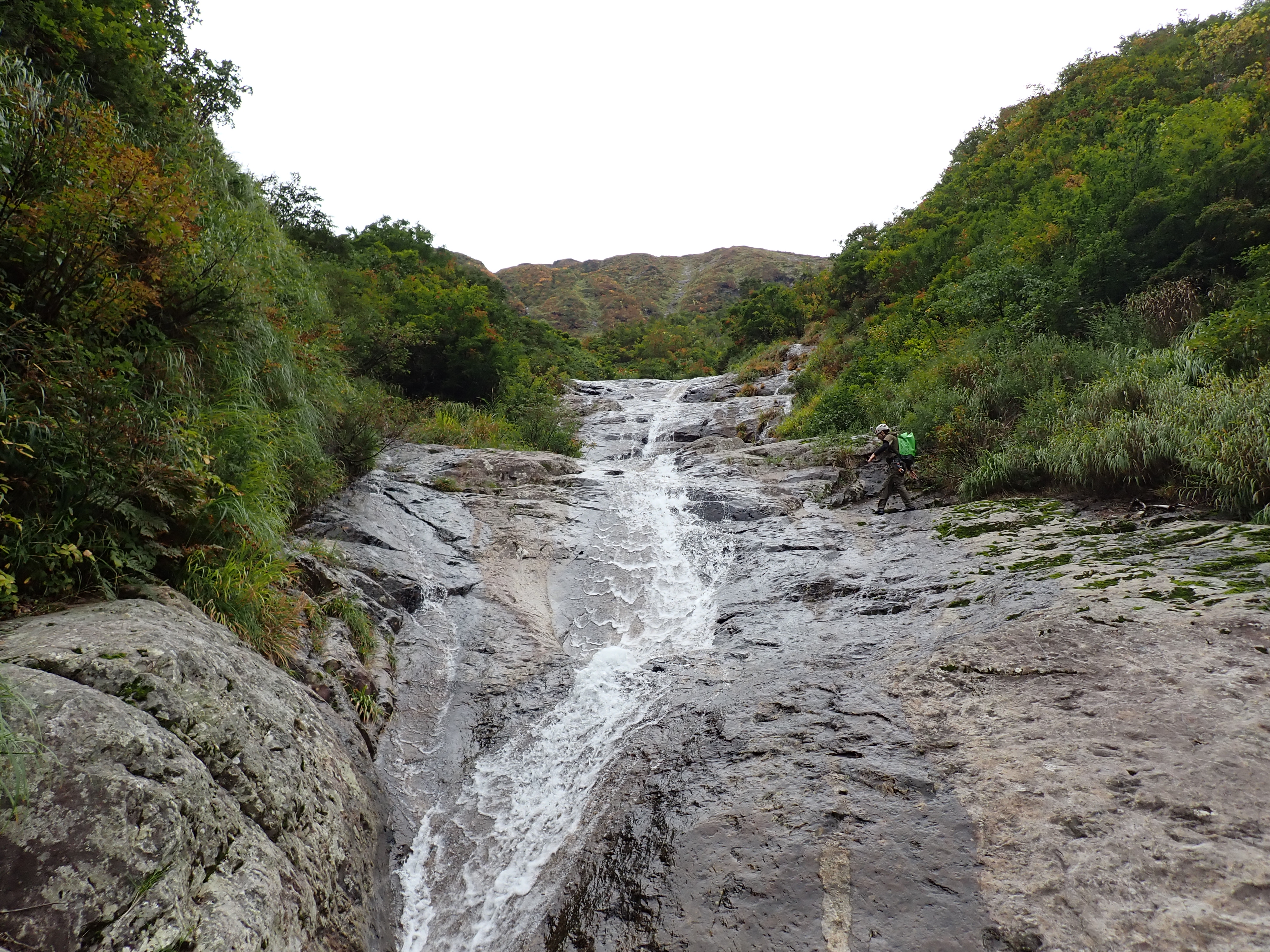 後半の連瀑はやや藪っぽいが、越後三山をバックに快適な登攀が出来る。