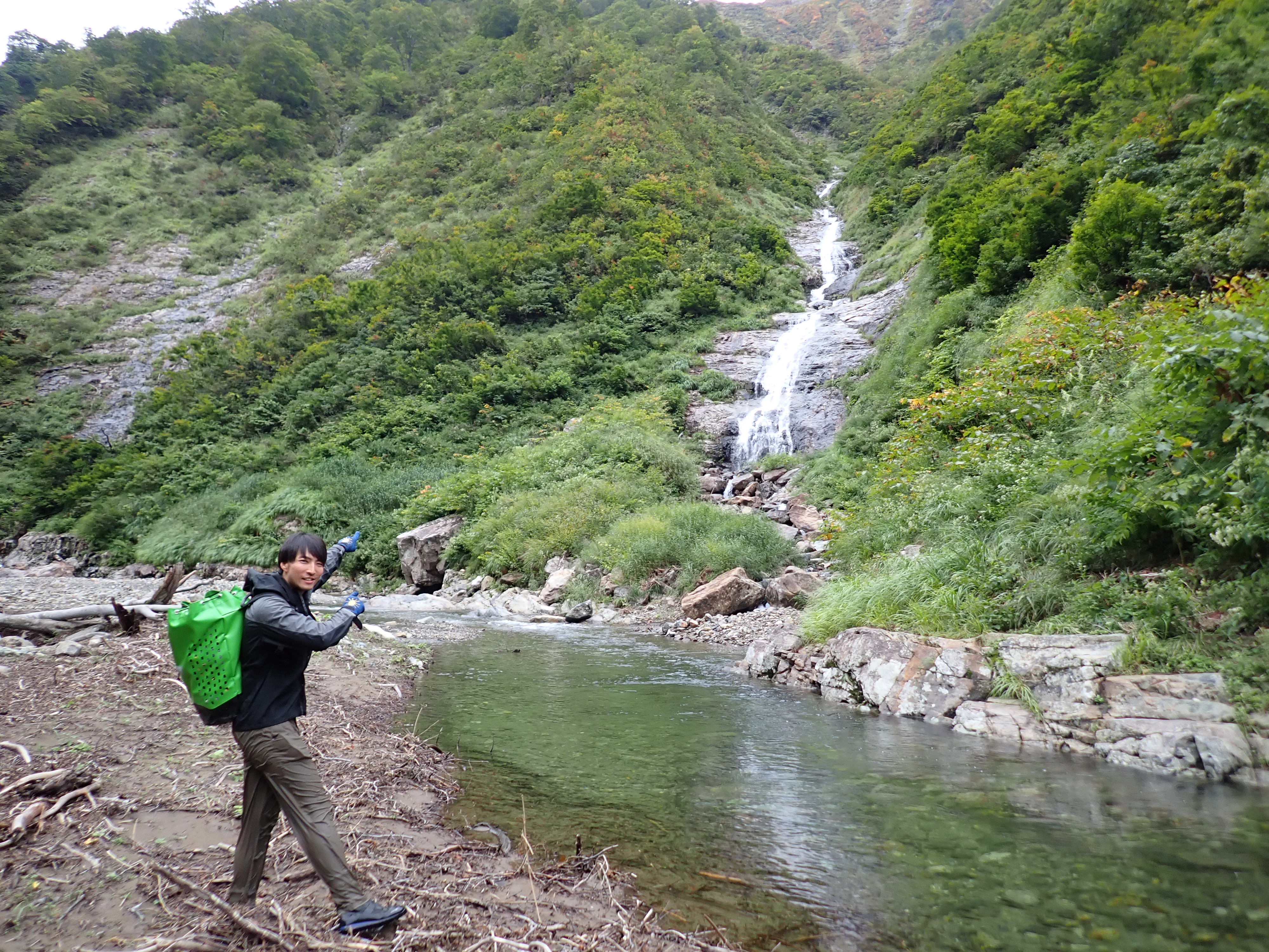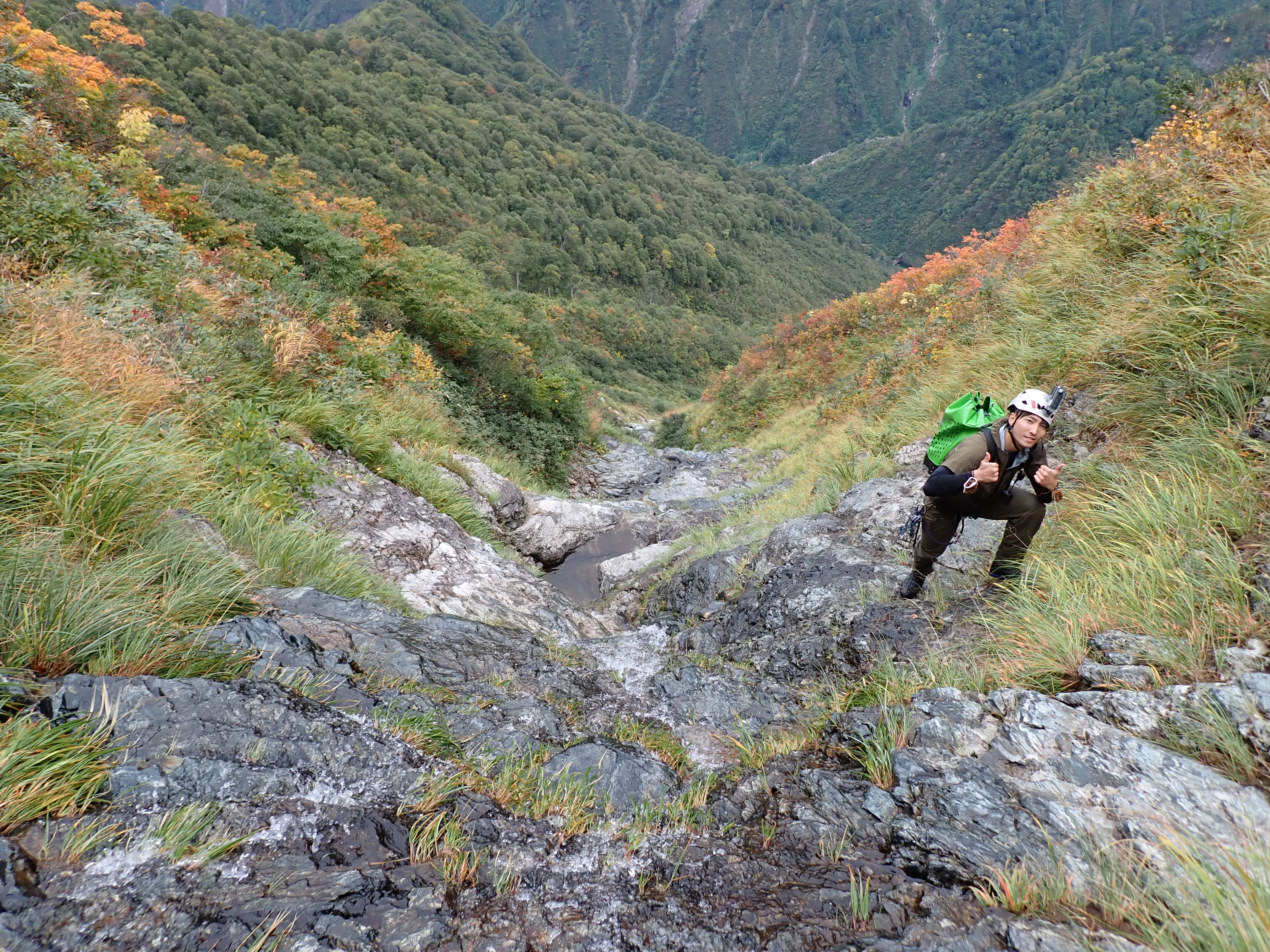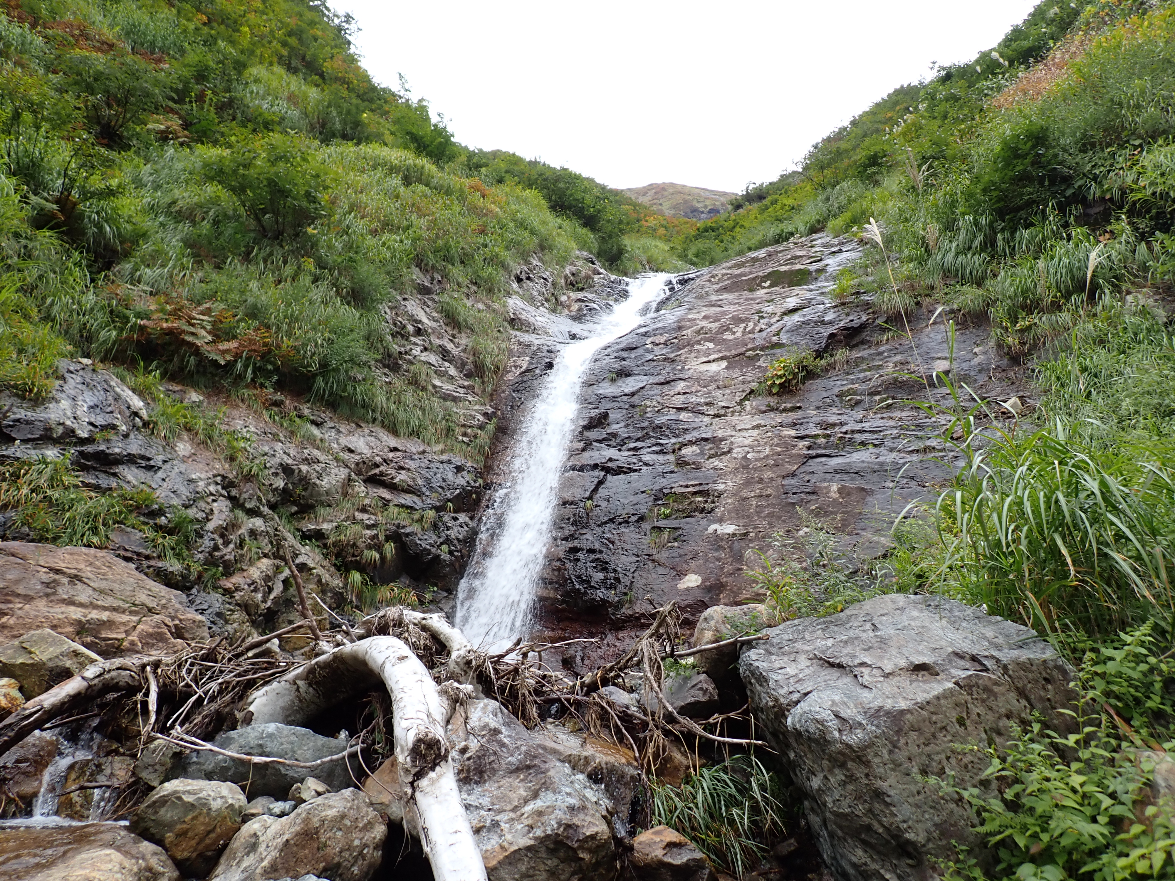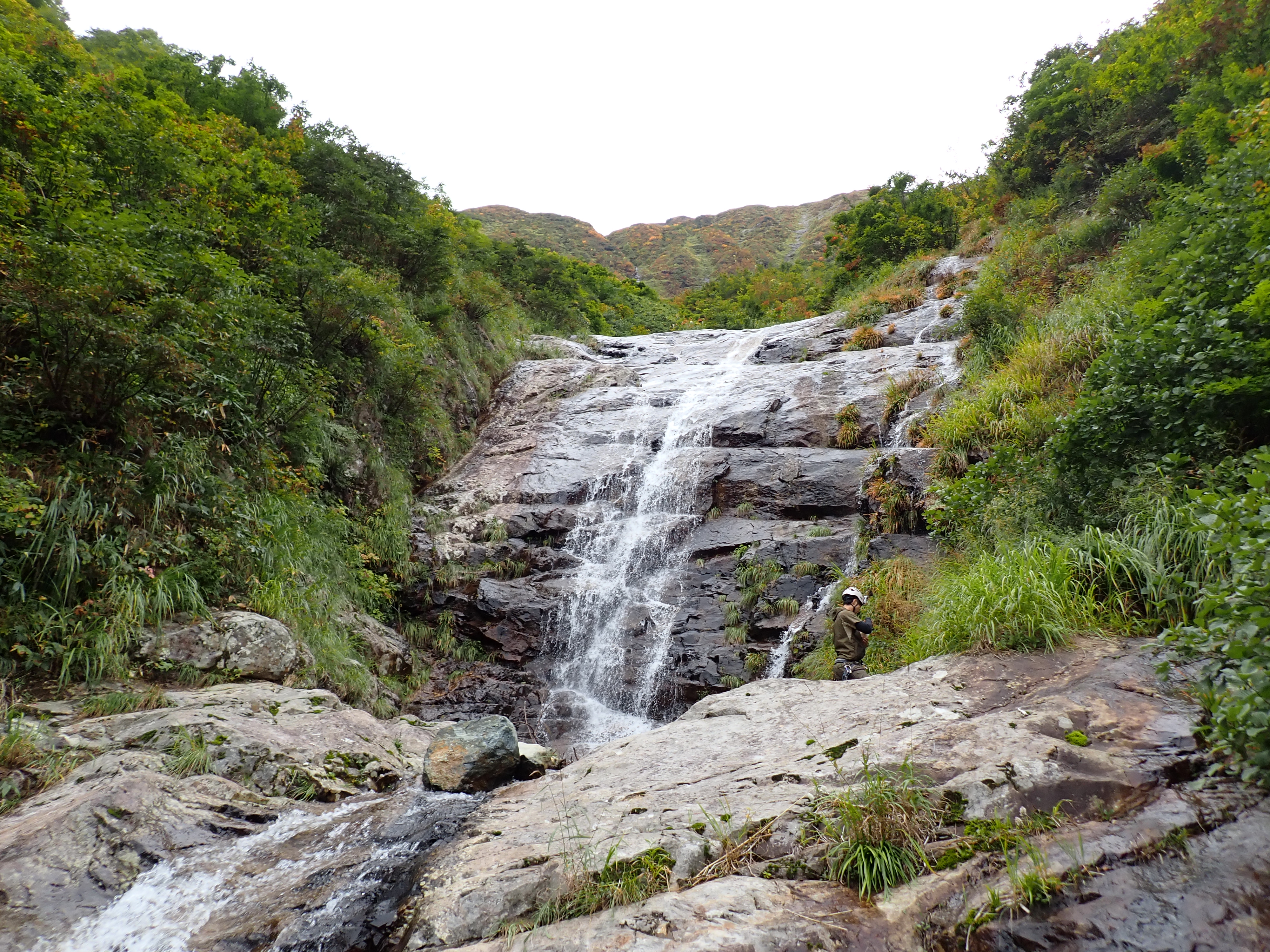 後半の連瀑はやや藪っぽいが、越後三山をバックに快適な登攀が出来る。