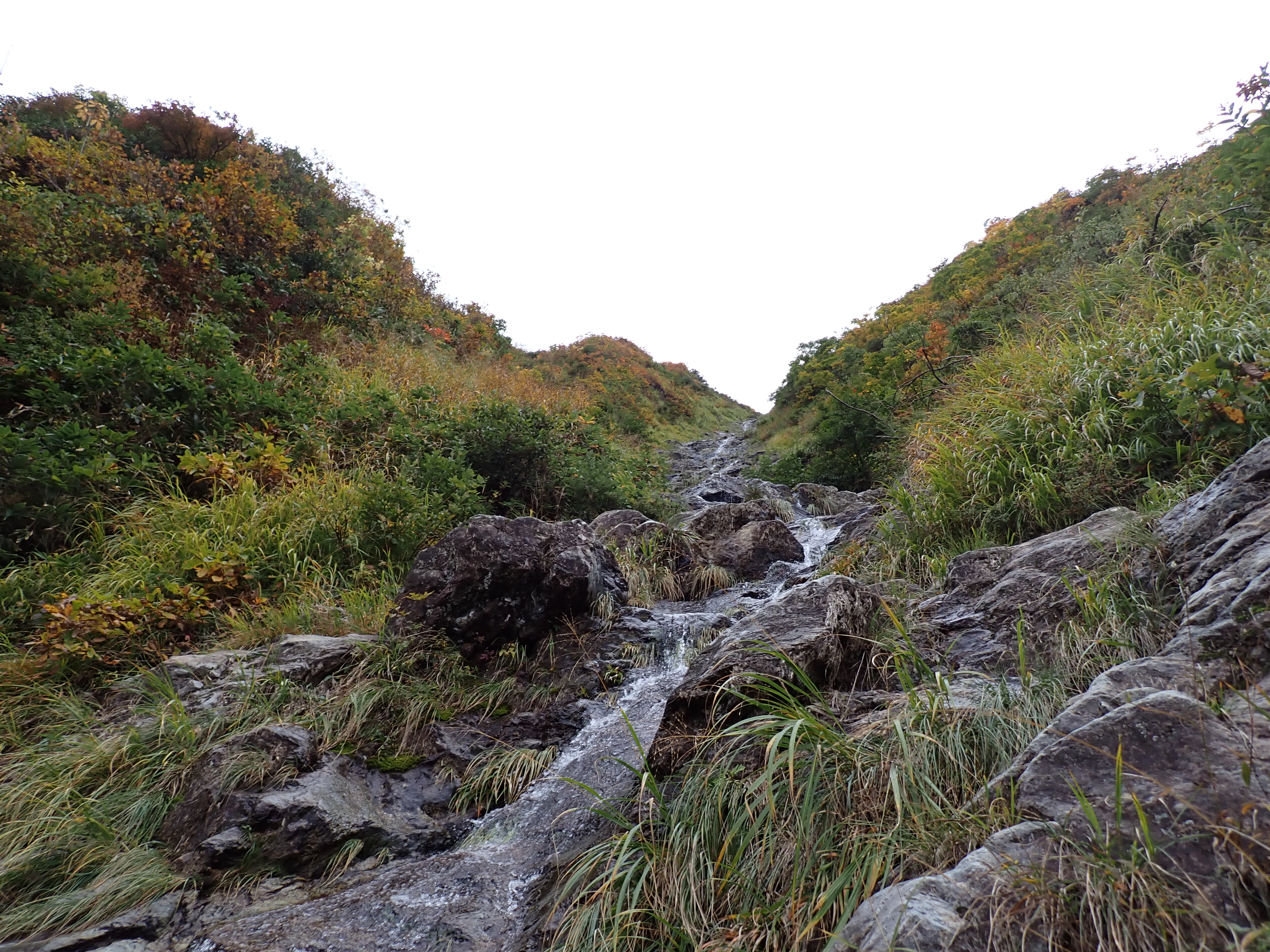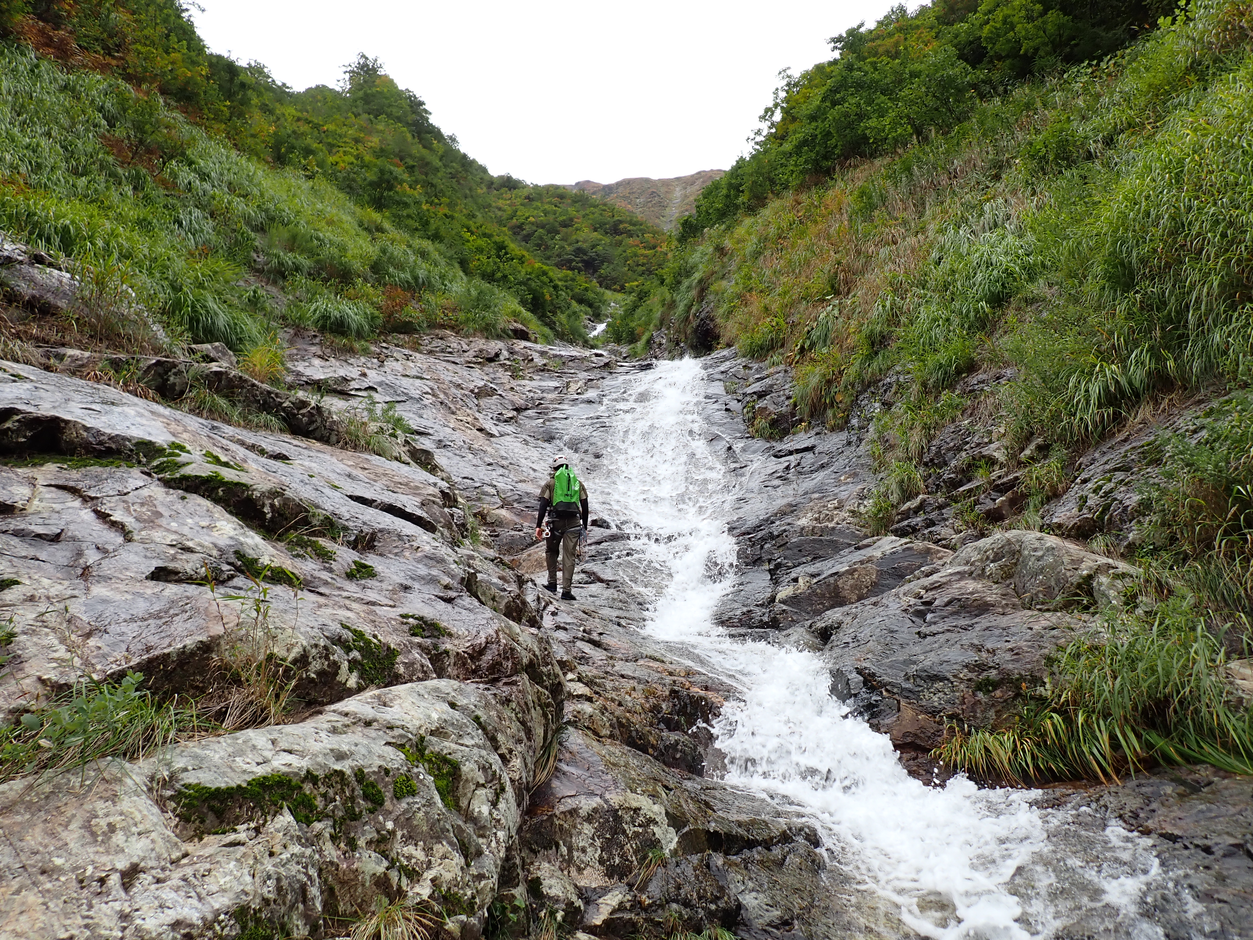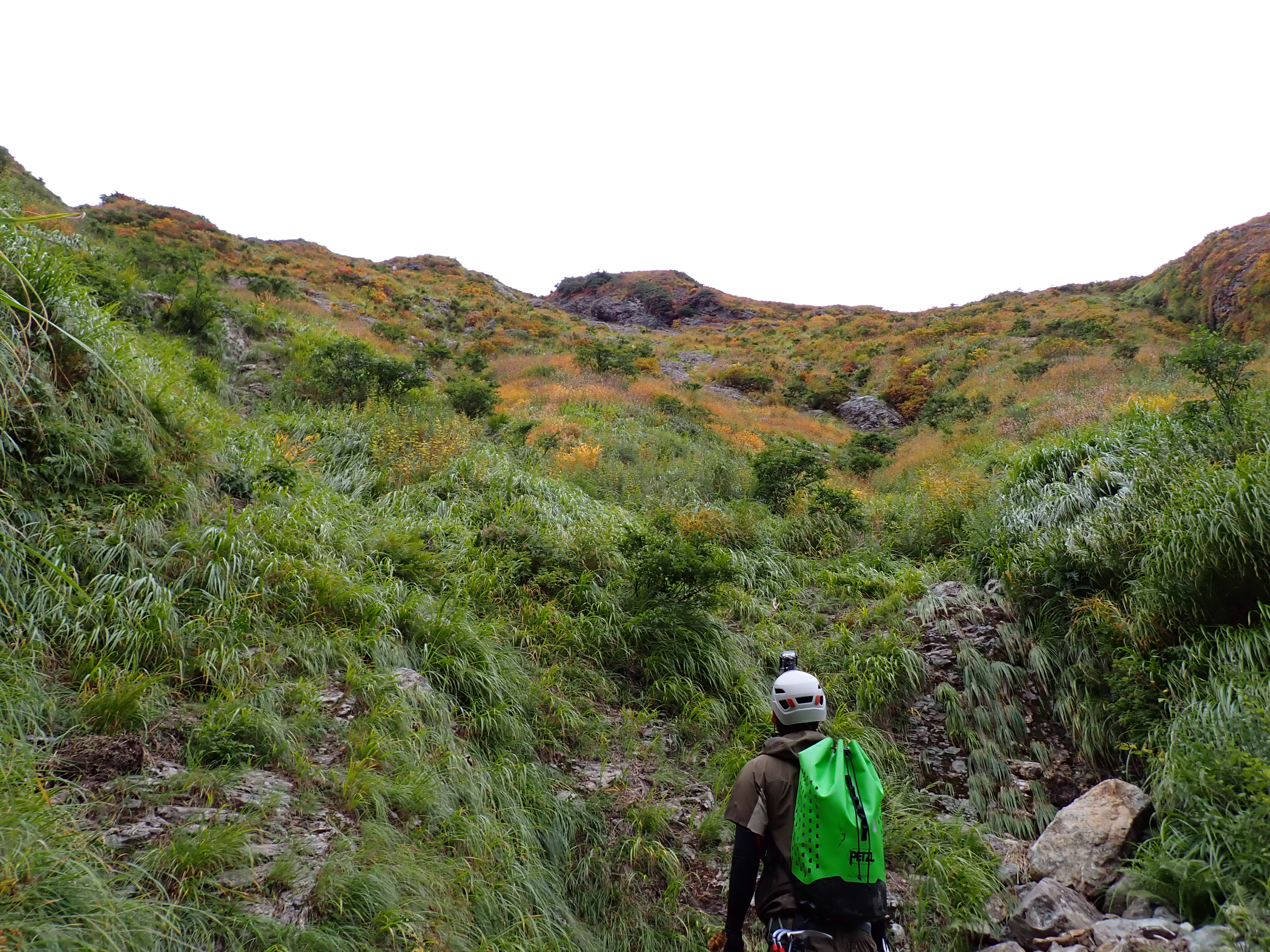 ゴルジュを抜けると源頭部。上に見える露岩を目指して登る。
