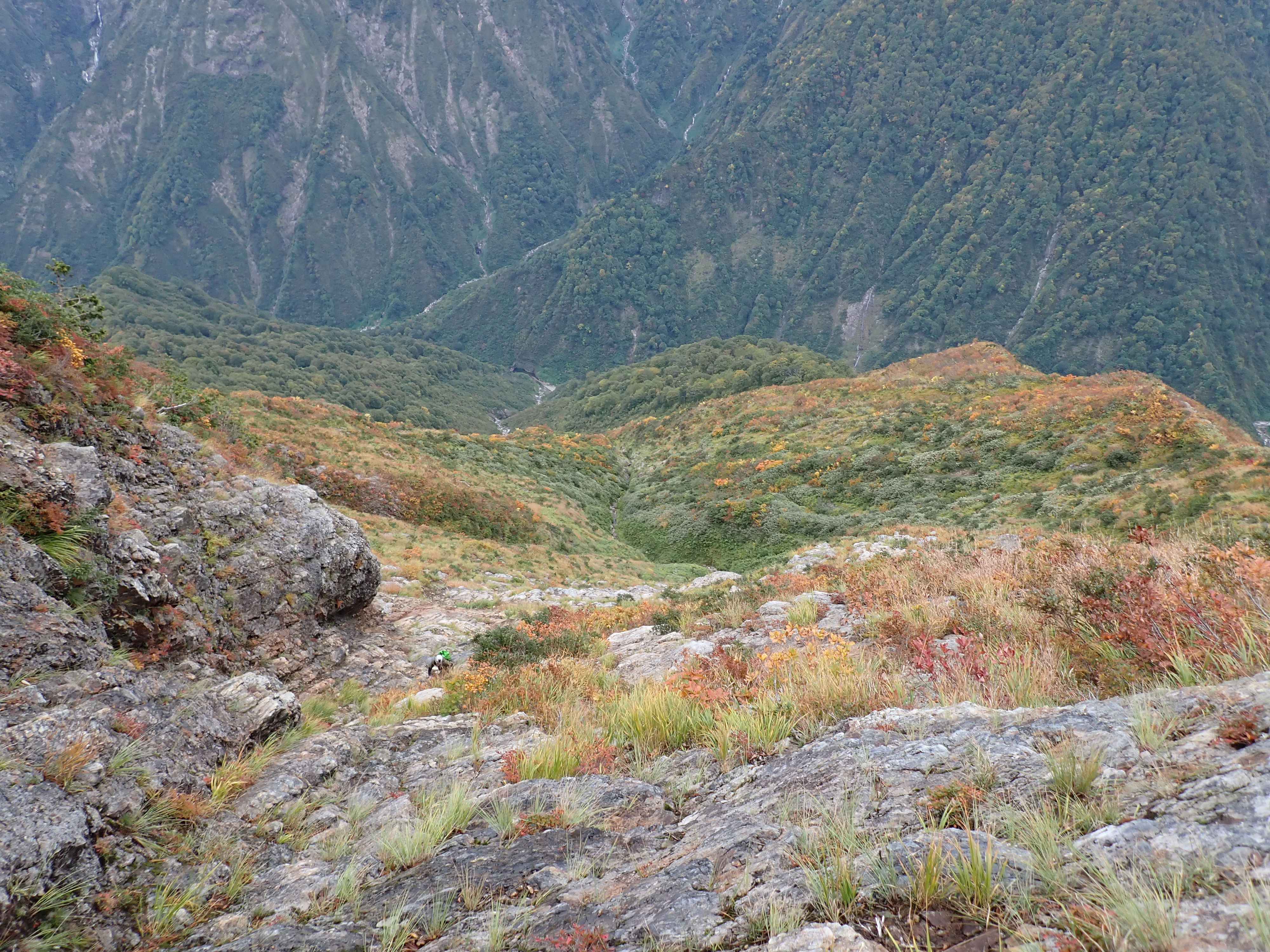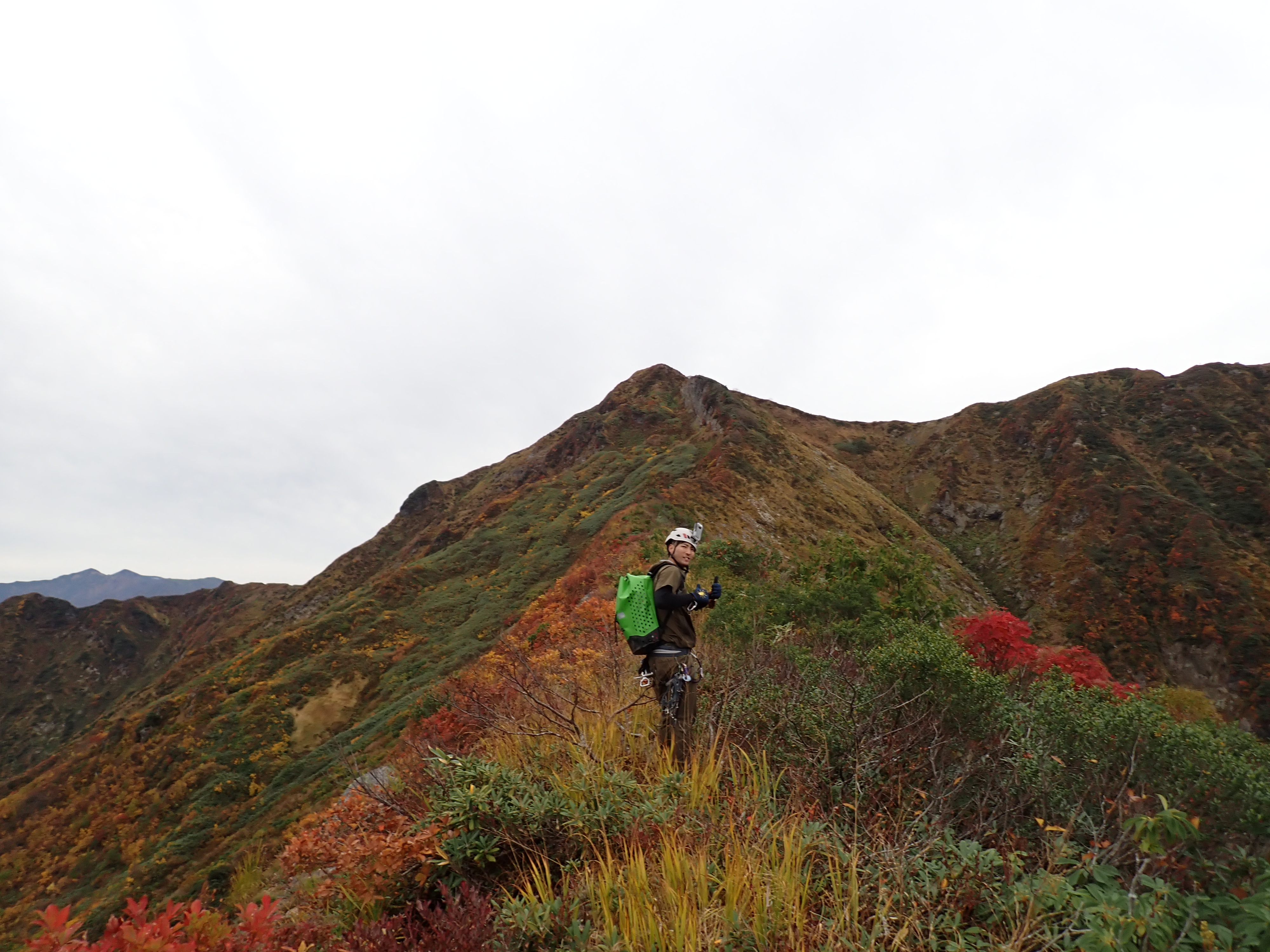藪尾根は意外と踏まれていて歩きやすい。一瞬、藪が濃い区間もあるが、ほとんど膝丈以下で普通に歩行可能。それにしても紅葉が素晴らしすぎる。