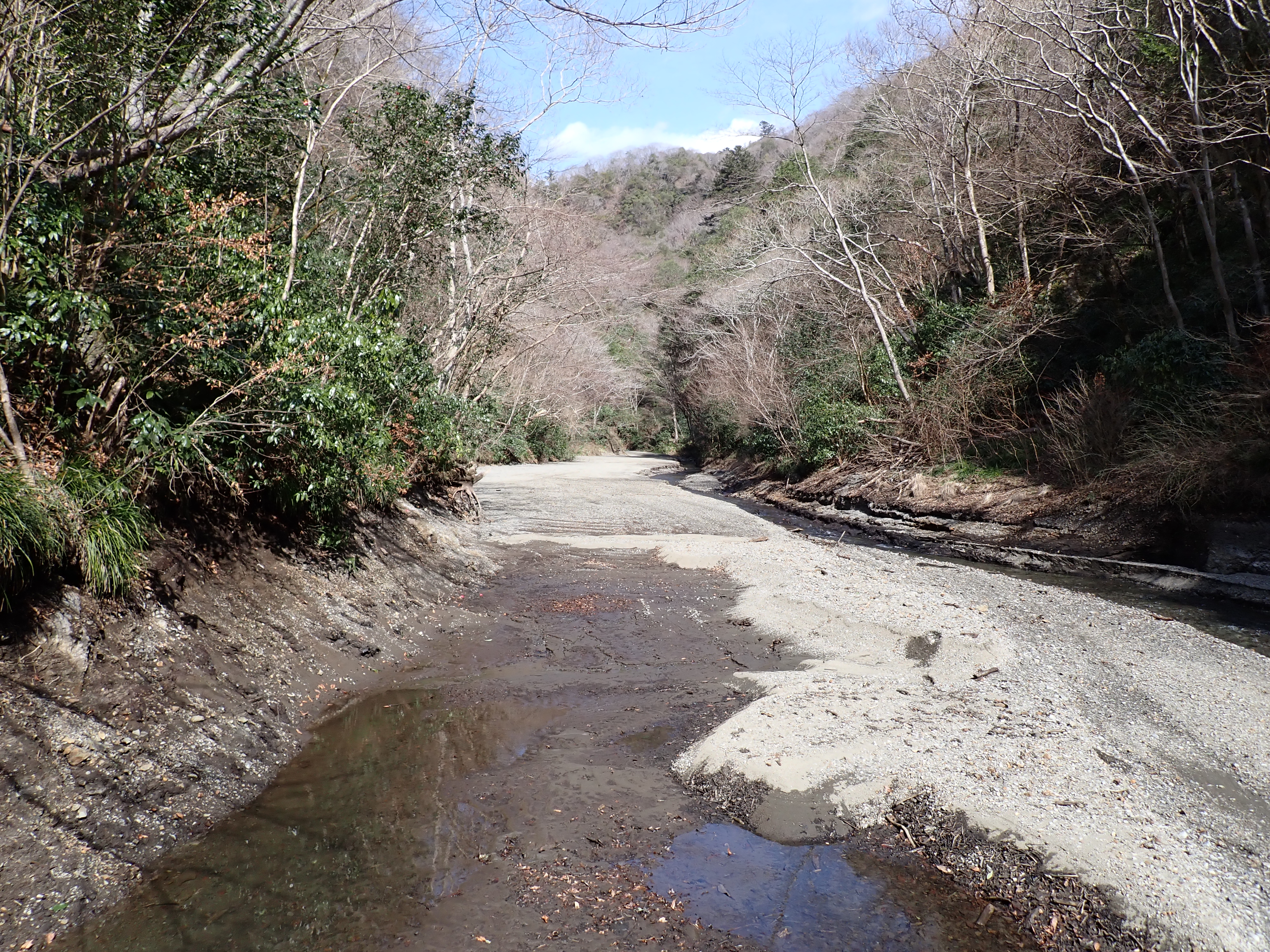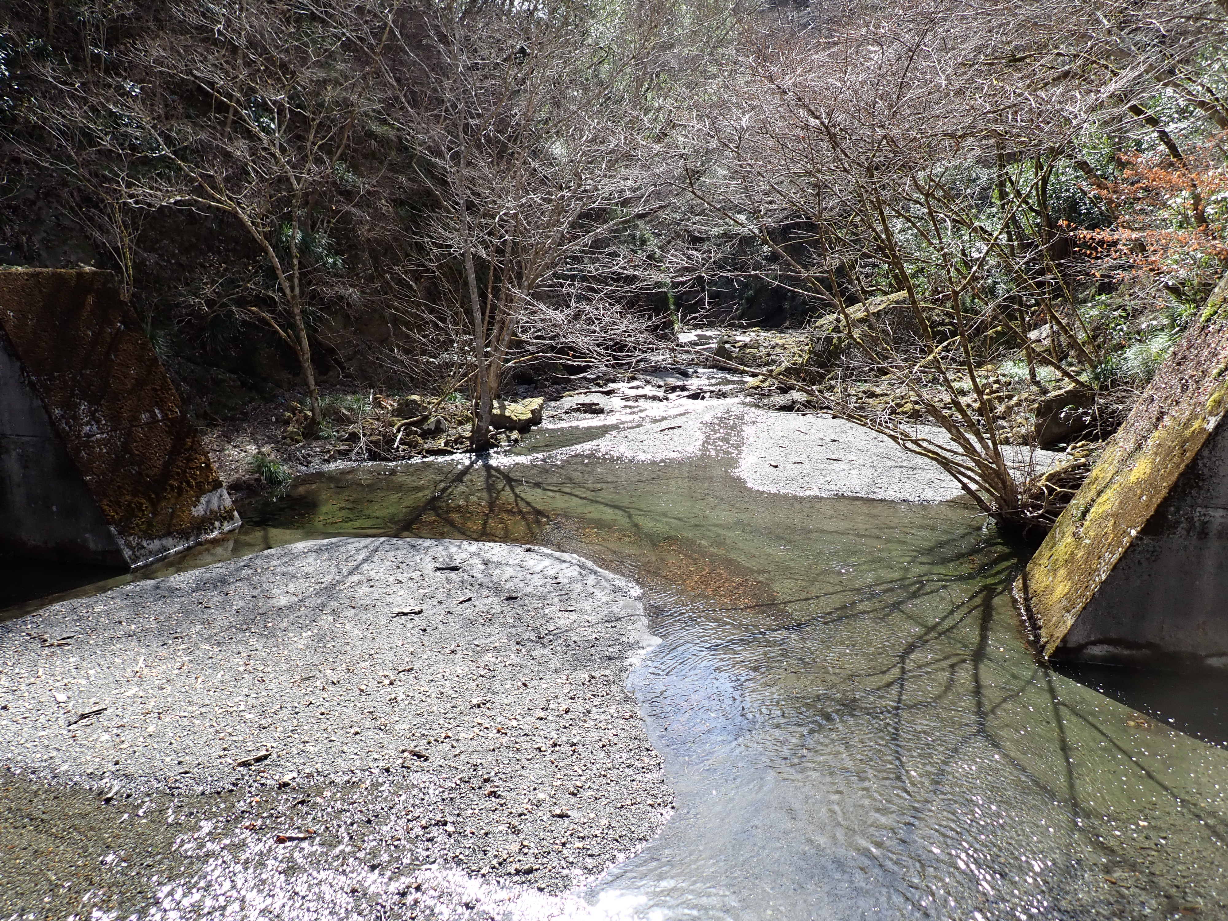気温も上がってきたので、鍋足南沢のおかわりで竜神湖右岸支流で気になっていた猿渡ヶ沢へと向かう。右岸の歩道は崩壊していて面倒そうなので、対岸の林道からアプローチしてみる。
