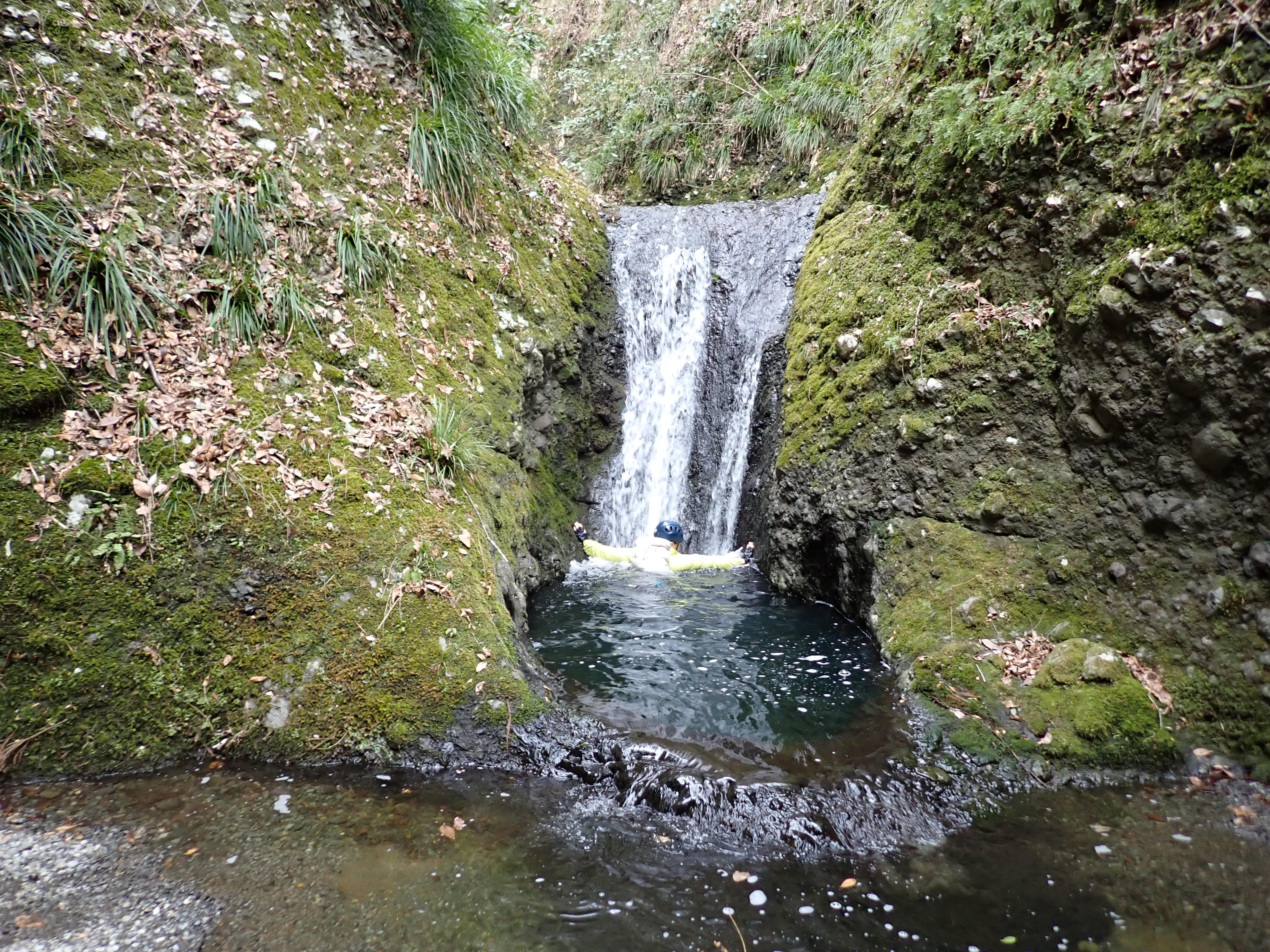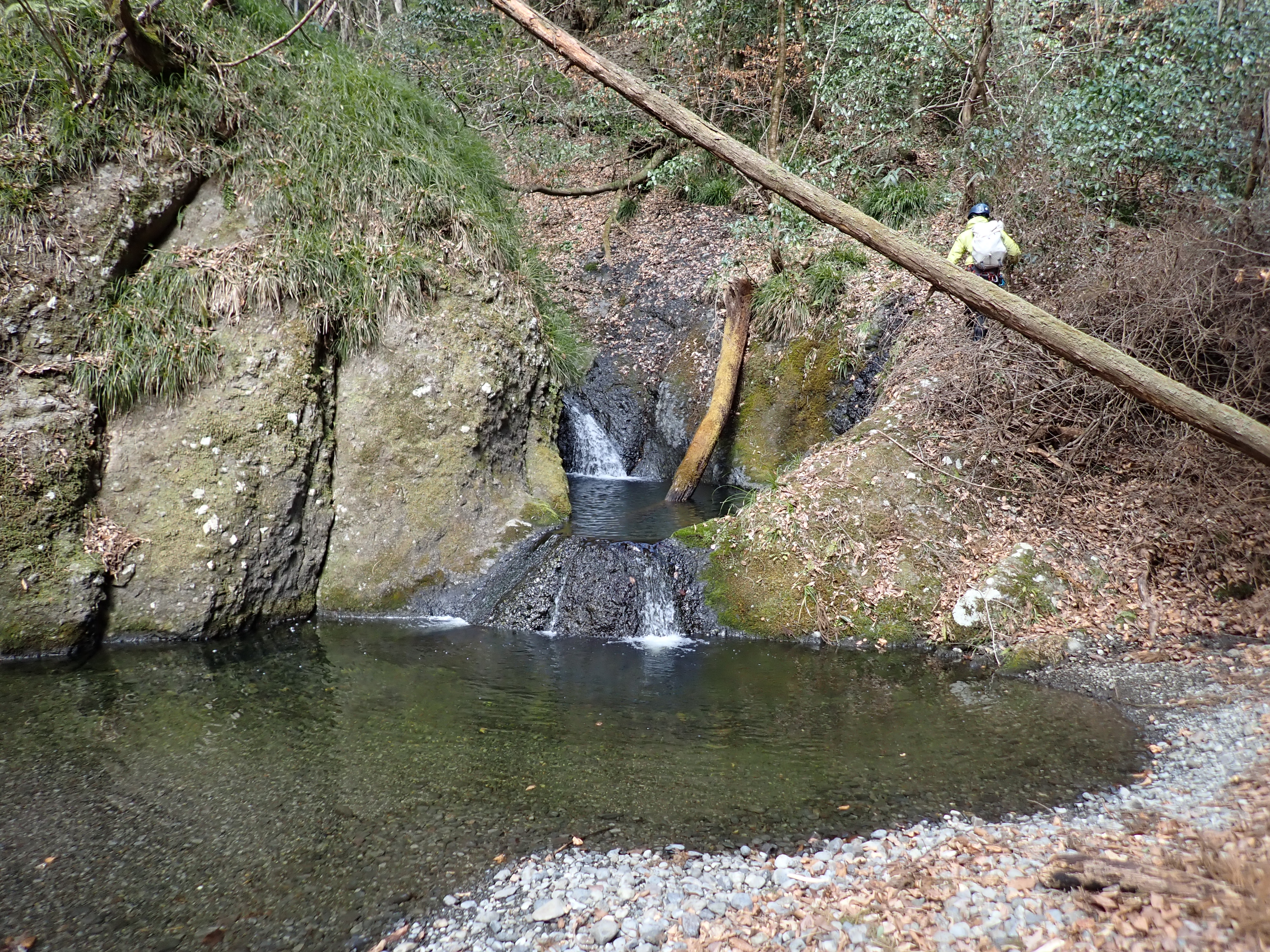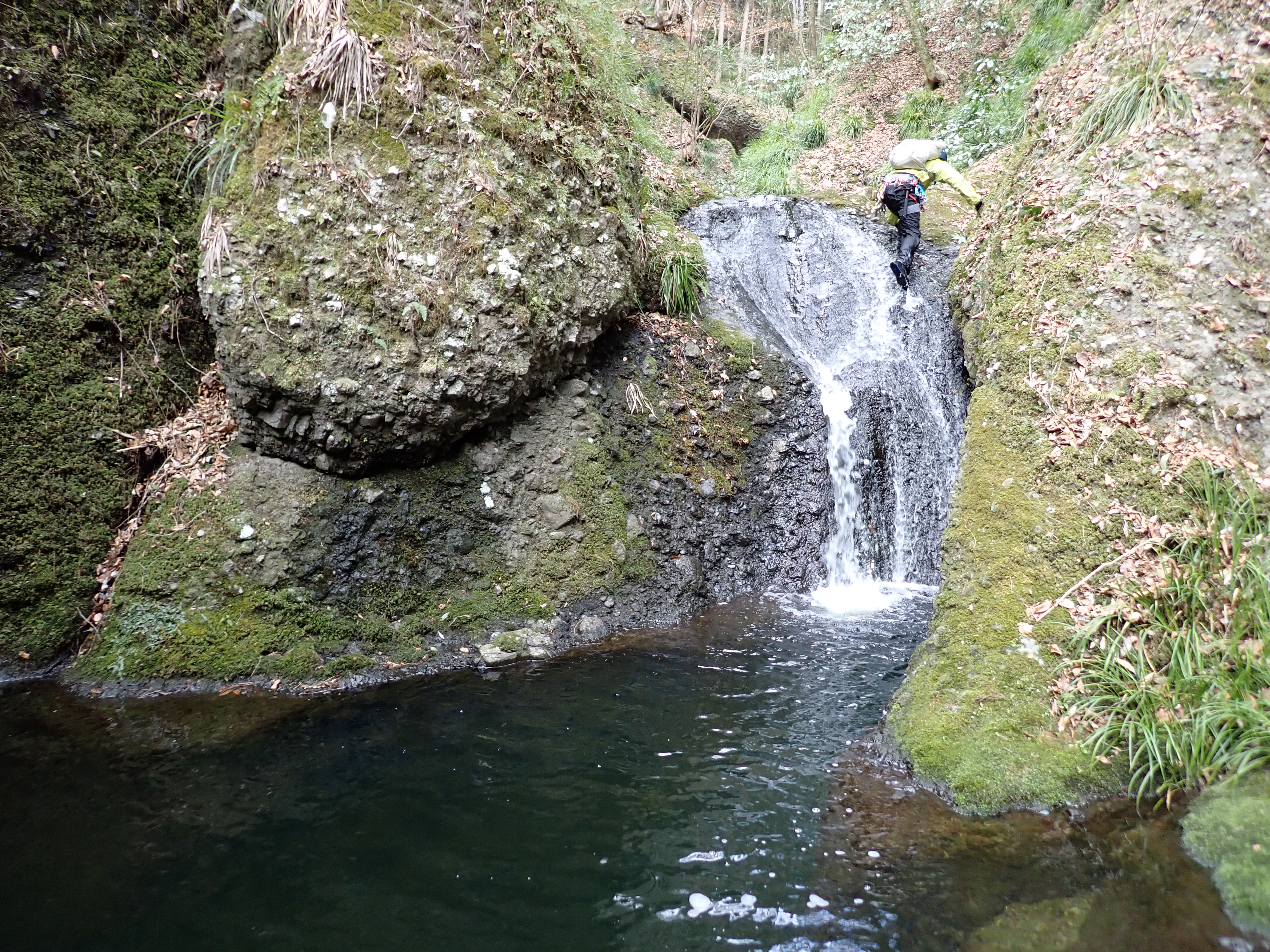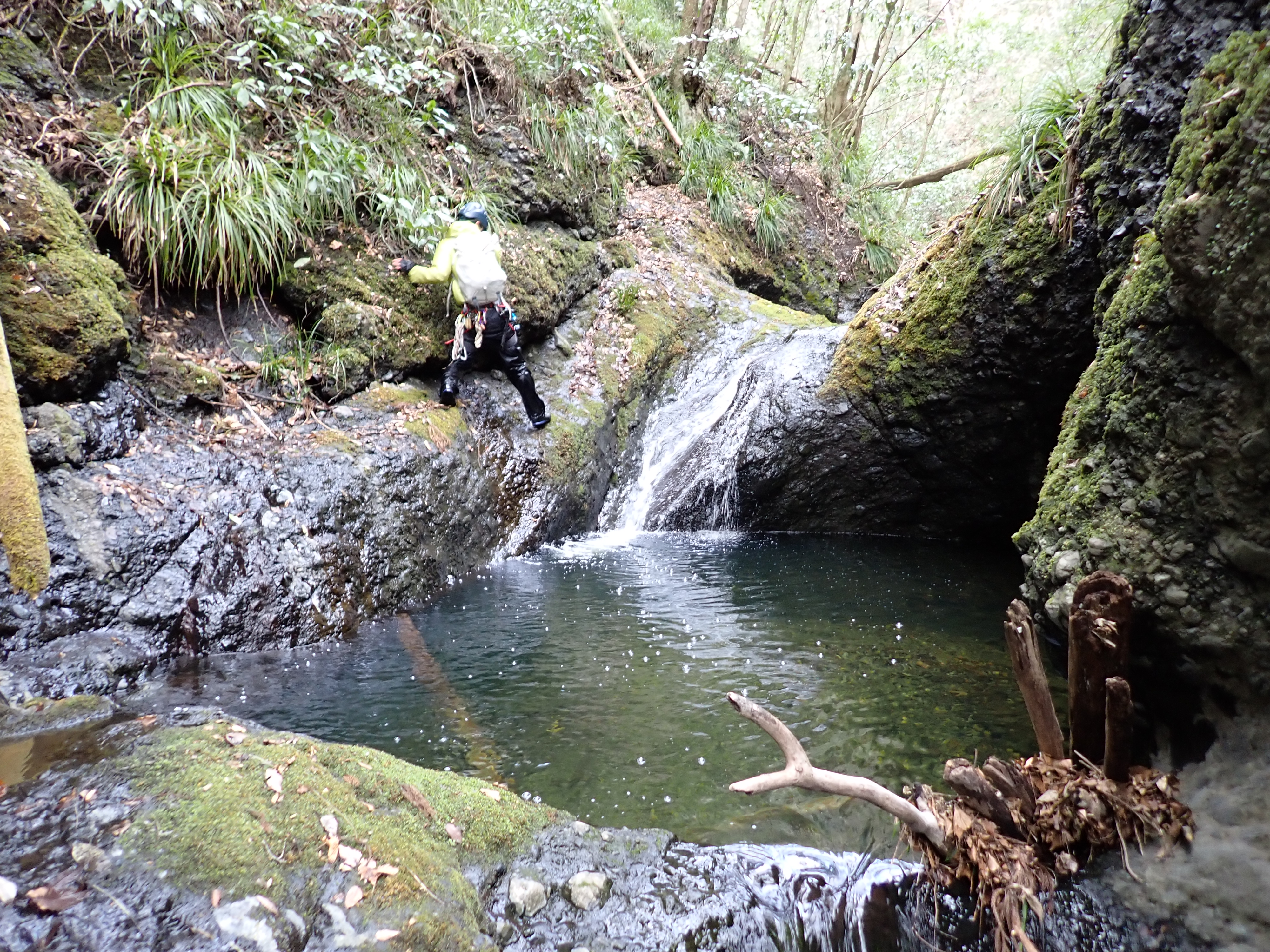 次の滝は登れる系。対岸にジャンプして流心を登る。釜はとても深い。