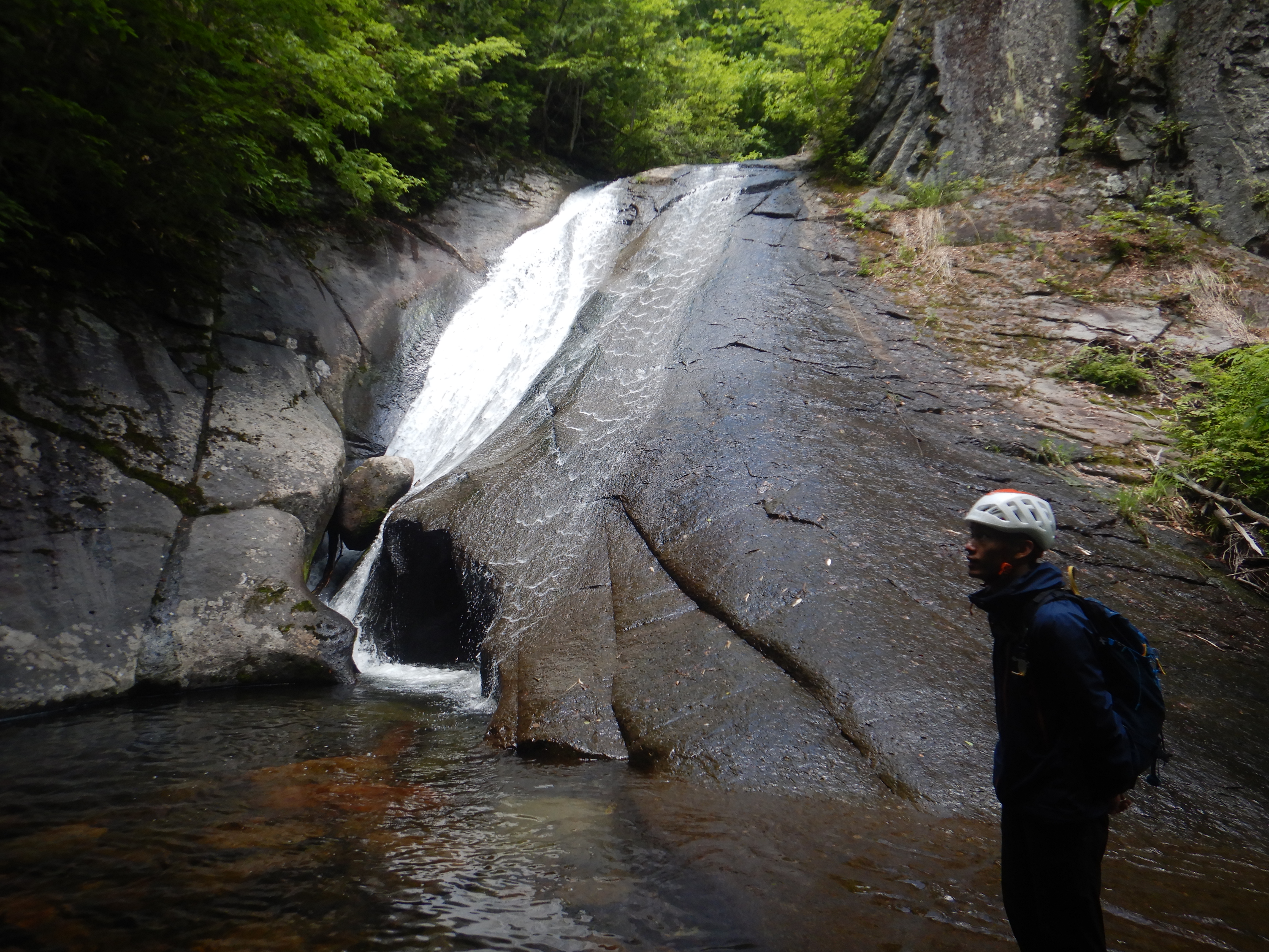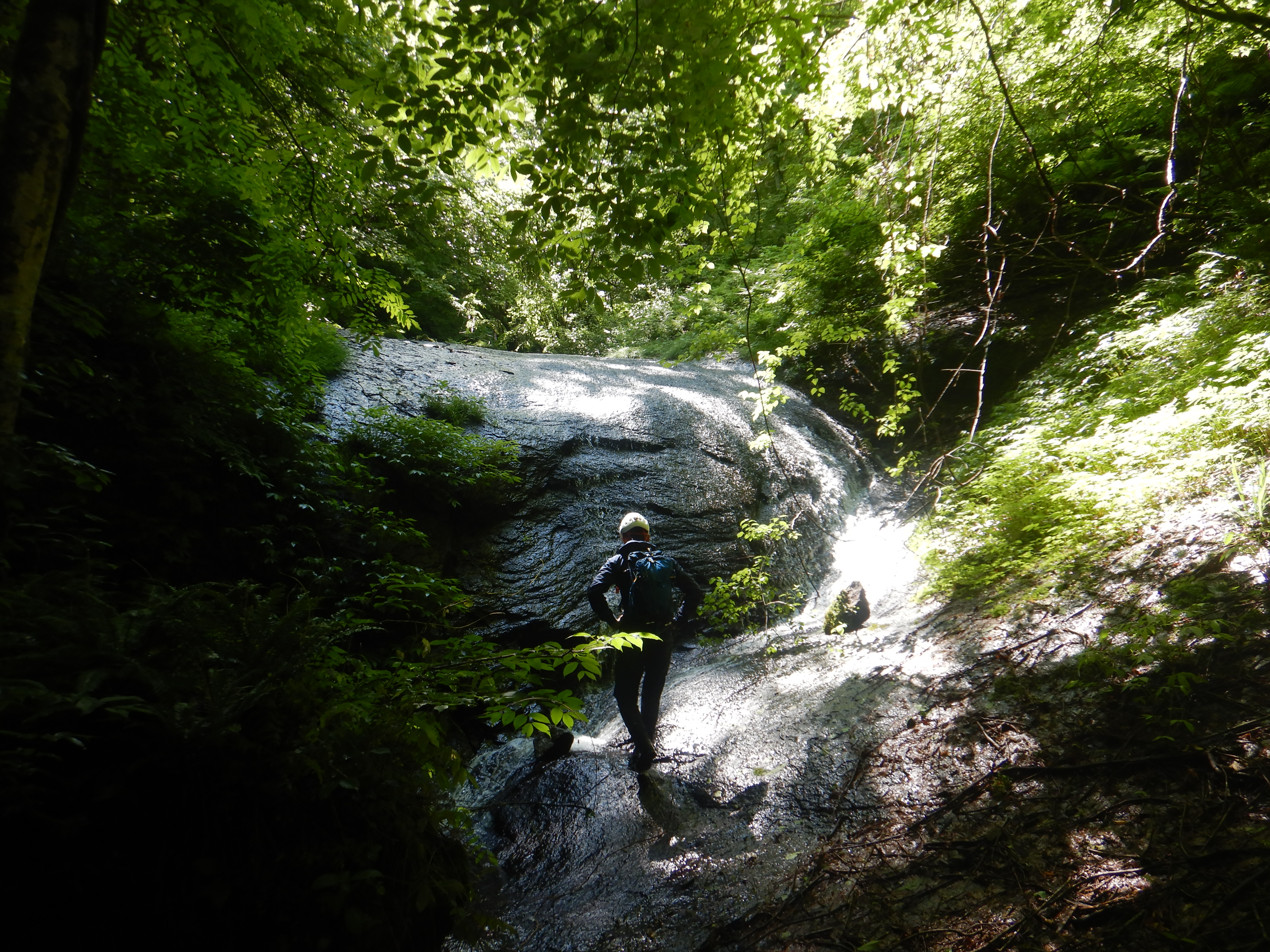 残置ロープでゴボウして登る。ここで上から下ってきたガイドPTと遭遇。このスラブ滝を下ってまた登り返して帰るんだとか。