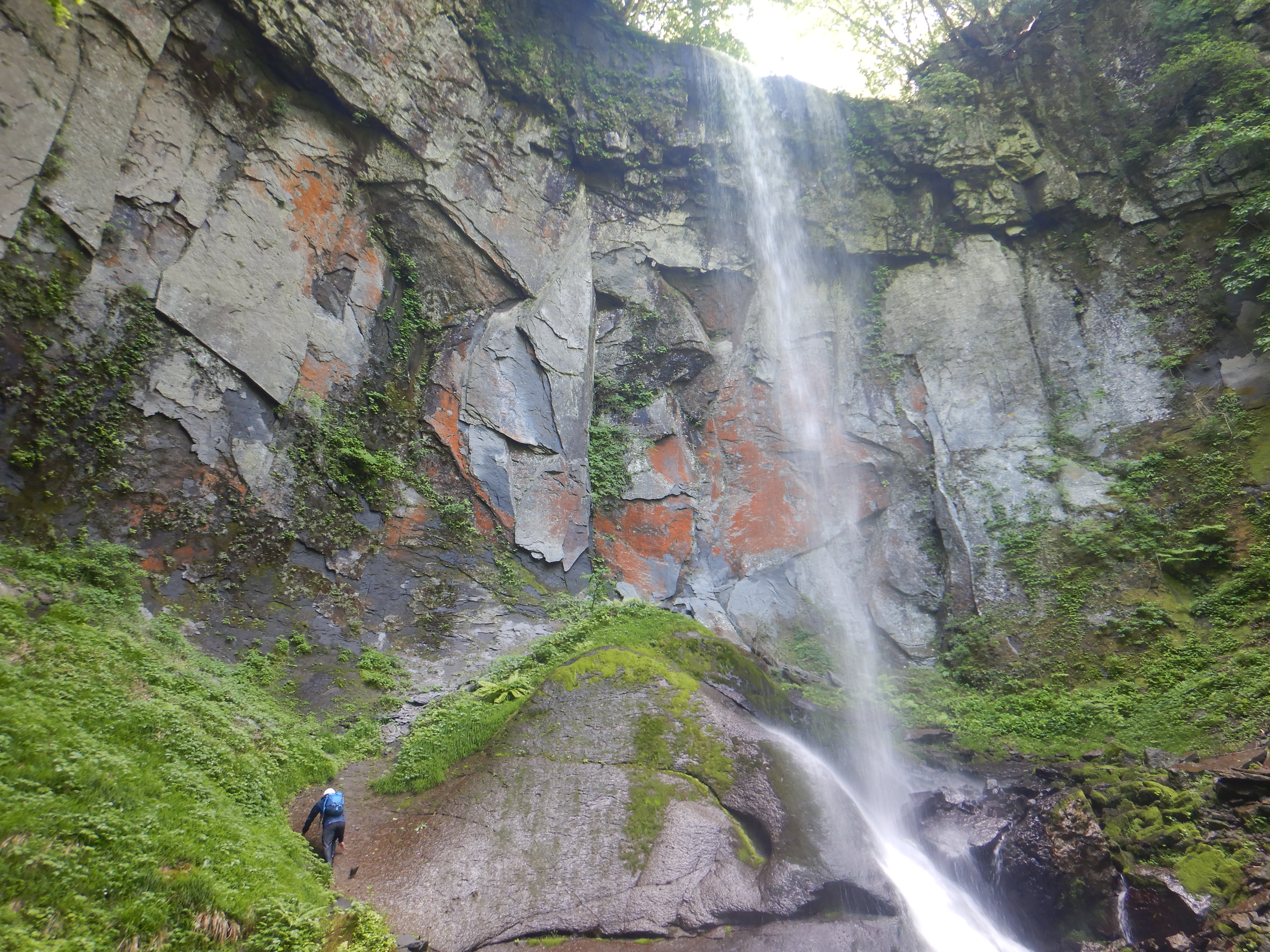 しばらく平凡な沢を歩くと岩洞滝が現れる。これは凄い迫力!