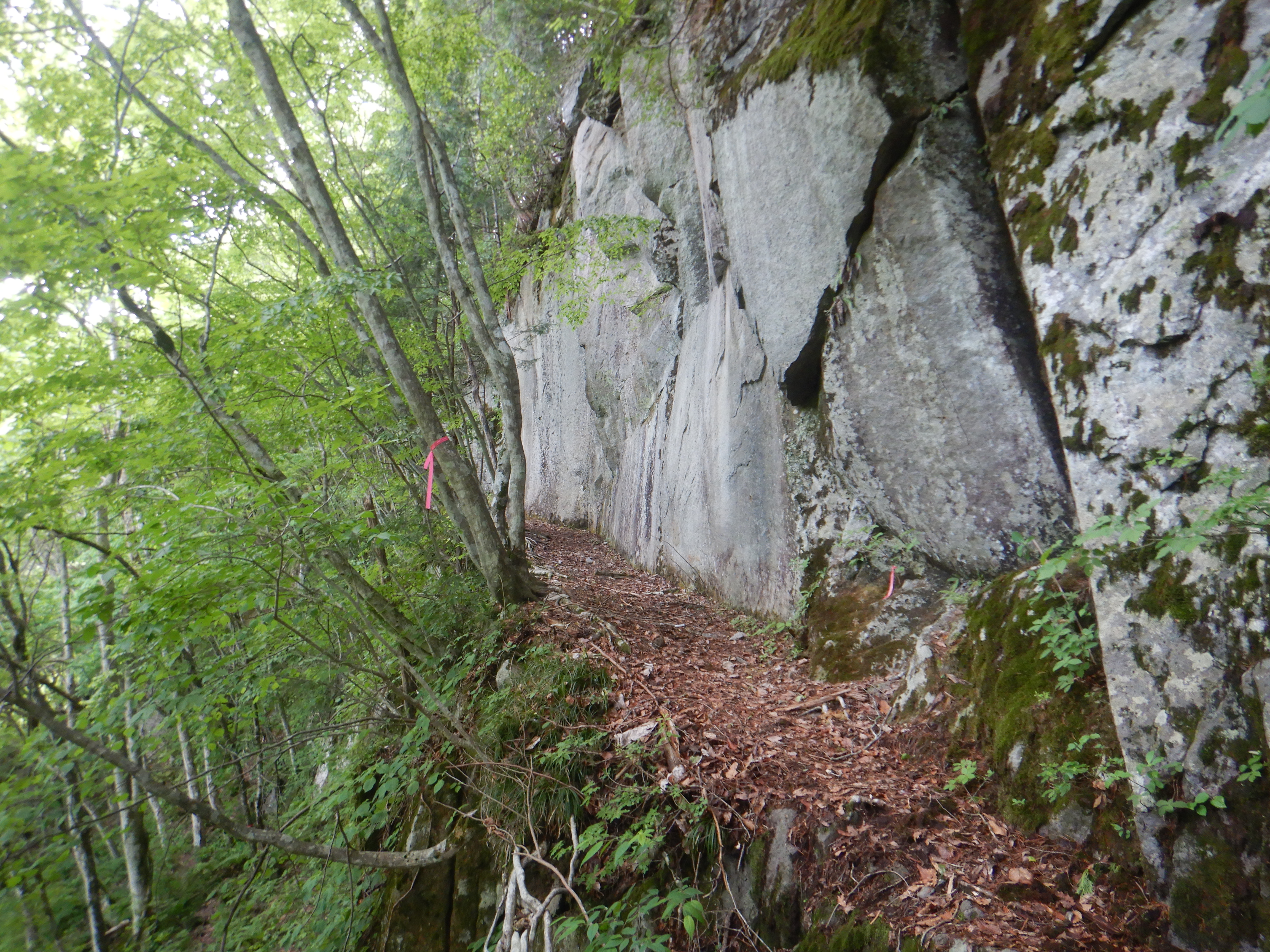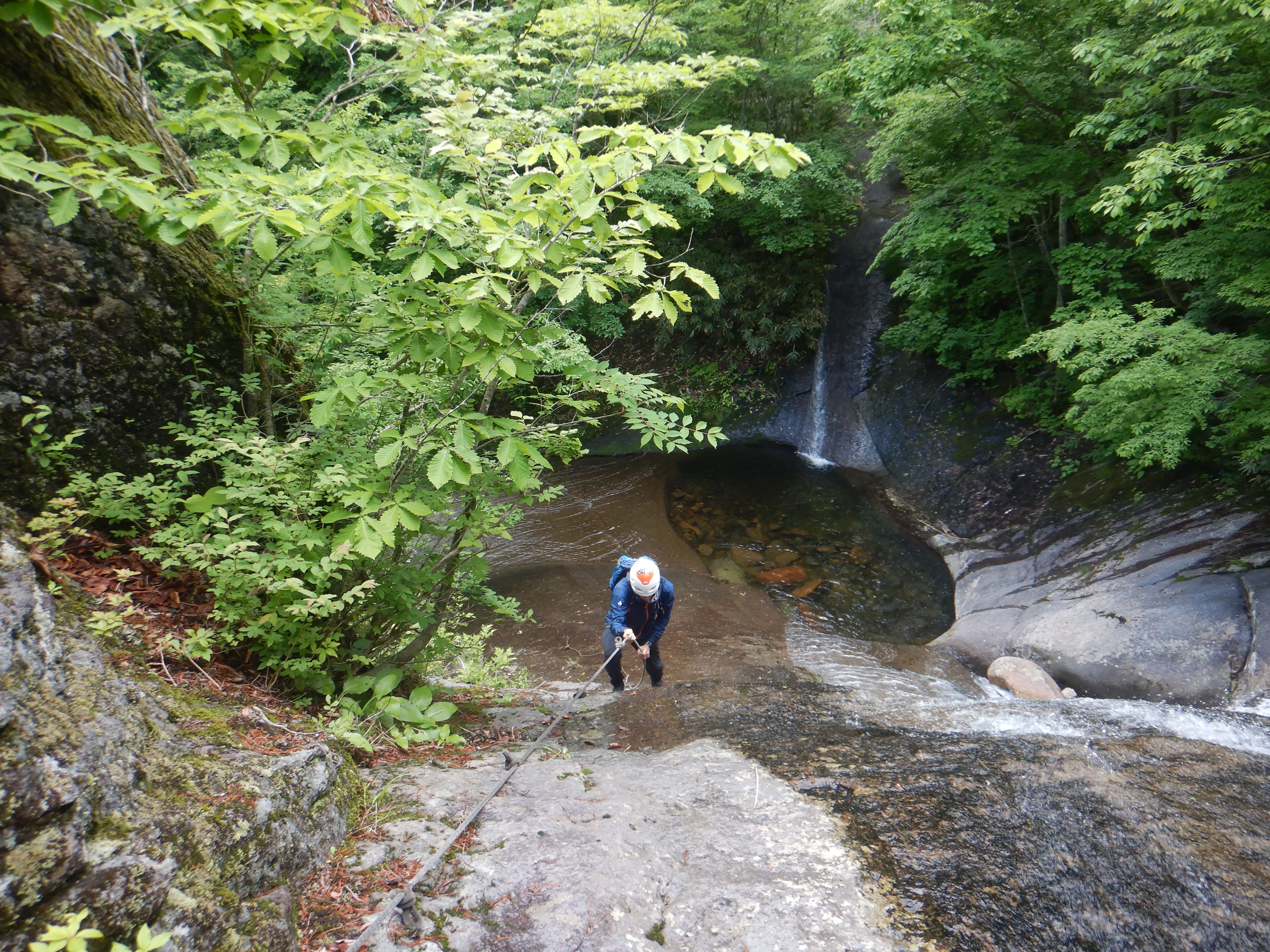 左岸を登って行くと岩壁の基部沿いに明瞭な巻き道。最後は残置ロープがある斜面を下って滝上に復帰した。