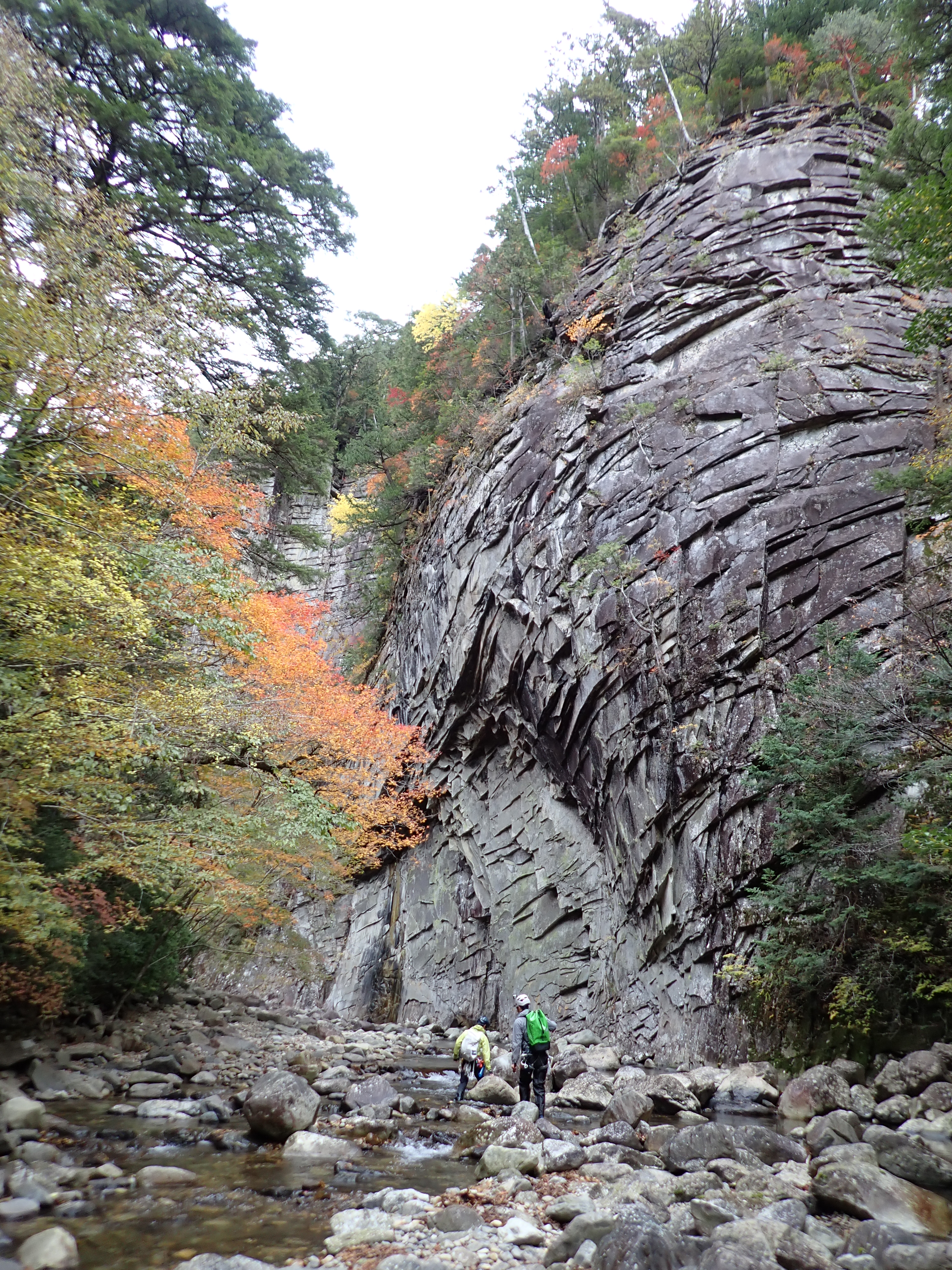序盤は平凡な河原歩きになるが、周囲の見事な岩壁が楽しませてくれる。